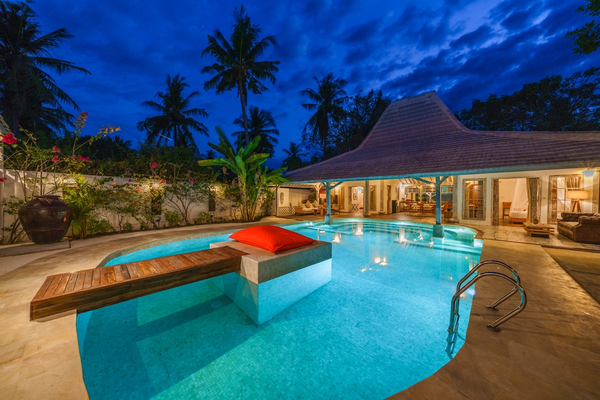 This beautiful 3-bedroom private villa named Joglo Jade offers private gardens and a large swimming pool with waterslide for the kids. There are 3 bedrooms all offering en suite bathrooms and rain showers. The Joglo is over 120 years old and presents a spacious living and dining area plus a large fully equipped kitchen with oven, espresso machine, breakfast bar and cold-water dispenser. This villa is great for couples or families with plenty of space to enjoy.