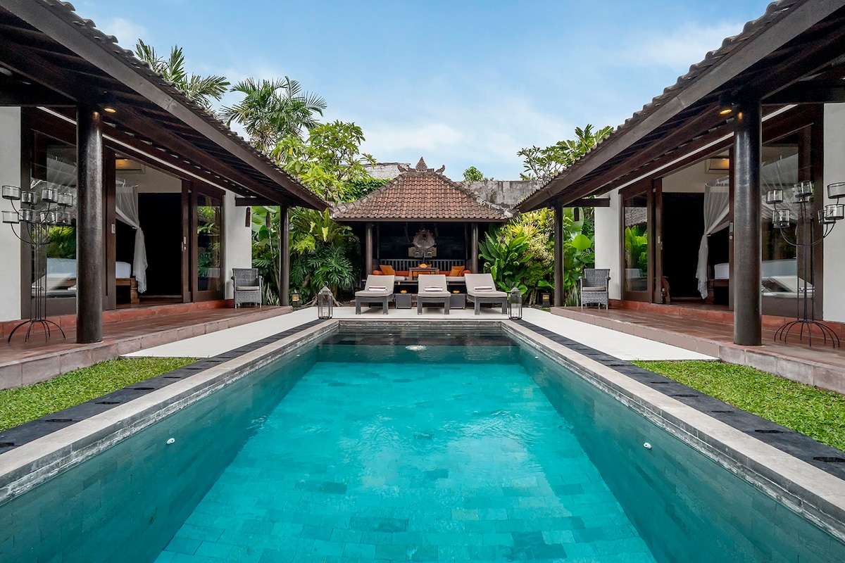 Recline on a day bed for a mid-day rest in the placidity of the poolside patio enveloped in tropical greenery. For the industrious folks we ensure high speed fiber optic Wi-Fi that sets you up for success and makes sure you get things done. Leave your worries behind and let the villa staff take care of you and just relax in the beauty of the space. Our villa staff will be delighted to attend to all wishes and needs; be it arranging day trips, renting scooters, or preparing breakfast at the villa. We are looking forward to your stay. We will make sure that you are very well looked after. Beautiful open living room, dining area, & pool-side gazebo for massages & to relax. Enjoy a relaxed breakfast with fresh fruit & fresh juices at the villa. Please note that there will be and will only charge you the cost of ingredients. for her efforts as she will take care of the shopping, preparation, and cleaning for you afterwards. We also recommend to try out some of the great restaurants in close walking distance like Kilo Cafe or Principle Cafe which also offer great breakfast and coffee. We will be happy help you to arrange for motorbike/scooter hire & day trips - just let us know! We will also prepare fresh towels and bed sheets for you and are cleaning the villa for you 6 days a week (Sundays are off in Bali - if you require service on Sundays kindly let us know) including the service for pool & garden. There are security cameras outside of the villa which will be checked by our security guard who stays less than 5 mins from the villa for your safety. The villa has 2 bathrooms, each equipped with shower, bathtub, toilet, shower gel, shampoo, hand wash, towels, hair dryer, and scented oils and candles so you can fully relax at Villa Etania. Private safe, TV + DVD player, international power plugs, & WiFi included. A/C in every bedroom and fully equipped water dispenser included for cold and hot drinks (coffee & tea). Fully equipped kitchen including toaster, stove, oven, & microwave. Just let us know if you need anything else and we will do what we can to make it happen. Please share your feedback with us and let us know how we can make your stay even better next time! Looking forward to greeting you in paradise soon! Full access to all amenities - the villa is all yours! We are here for you when you need us but will of course give you your privacy - we are just a phone call away. The villa is set on a quiet, narrow street in the heart of Seminyak. A variety of boutique shops, award-winning restaurants, trendy bars, and vibrant nightlife spots are all within walking distance. The famous Double Six Beach is a short walk away. Villa Lunasol offers high speed, stable internet for those of you who like to stay connected.