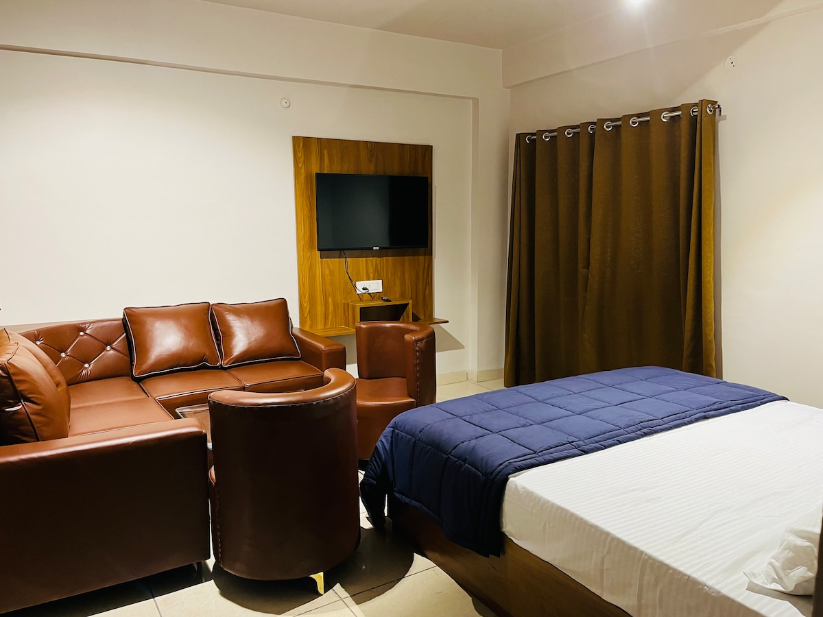 A self check-in, hotel-suite style studio in Vijay Nagar, Indore perfect for couples on a staycation, solo women travellers & working professionals. It has a queen bed, cozy lounge seating, TV, foldable work desk, Wi-Fi & a balcony. Thoughtfully designed interiors & a equipped kitchen, the space gives you the comfort of a hotel and the freedom of a home. 10 mins to Farzi Cafe & Piano Project 10 mins to C21 Mall 25 mins to Airport & Station Ideal for short/long & romantic stays in Indore.