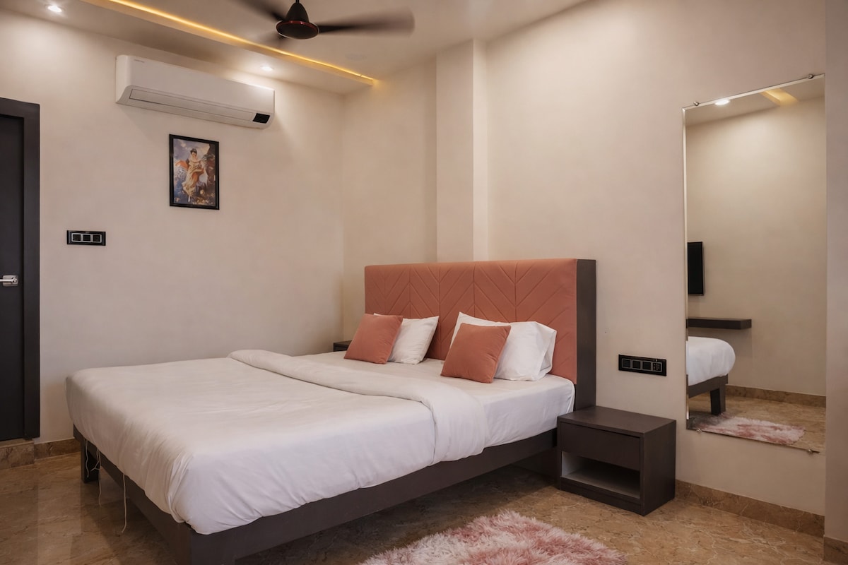 🌿 Cozy Private Room with Terrace Garden & Wi‑Fi Overview Welcome to your peaceful getaway in Indore — a warmly furnished private room in a bungalow featuring a comfortable double bed, private attached bathroom, air conditioning, and Wi‑Fi. Room located on third floor with stairway access only Highlights • Terrace garden access • Elegant private bathroom • Reliable Wi‑Fi connection • Air‑conditioned room Guest Experience • Calm, residential bungalow setting • Perfect for guests under 55