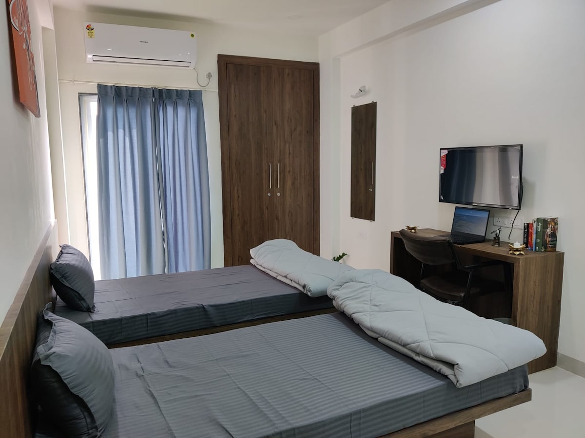 Spacious studio apartment with all modern amenities Air conditioning, orthopaedic memory foam mattresses, Smart TV, High speed broadband 200Mbps, induction cooktop, digital storage water heater, pressure booster, etc. Situated in posh locality 74 C Scheme Vijaynagar of Indore. The prominent feature of Vijaynagar is, it is part of main city and it is abode for privileged class. All good restaurants, hotels, shopping malls are nearby. Yet it is very quiet & calm. Scenic view from the balcony.