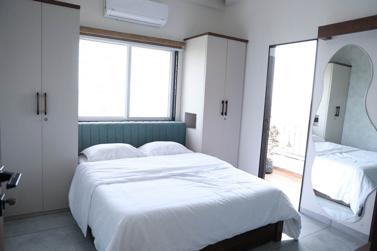 Forget your worries in this spacious and serene space. Relax in this luxurious 375 sq.ft. 1RK designed for premium comfort. Enjoy a private front balcony, fully equipped kitchen with personal RO, and a plush 7’x7’ bed with 8” memory foam mattress. Unwind on the 4-seater recliner sofa, stream on Android TV, and stay connected with free high-speed WiFi. Spacious wardrobe, big dresser, cloth hanger. Perfect for short and also long stays.