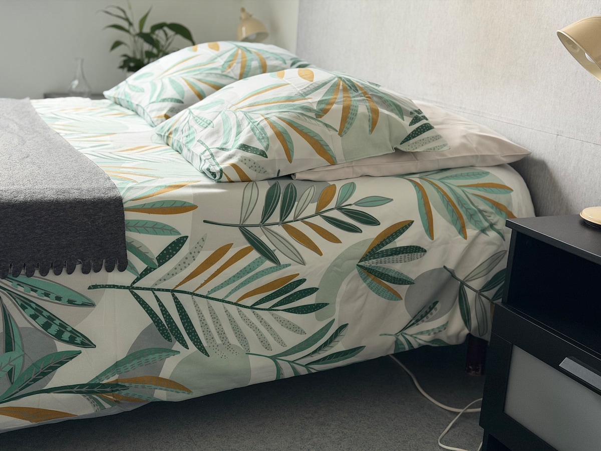 Venez découvrir mon logement lumineux avec grandes baies vitrées sur balcon expo sud. Une chambre lit 140 x190 , un bureau avec clic clac 140x190 équipé d'un point d'eau Situé au 2ème étage SANS ASCENCEUR dans une petite résidence calme arborée avec parking gratuit .Freebox, Wifi . Vous serez à pied à 2 mn d'un arrêt bus et à 12mn d'un arrêt tramway vers TOURS.J ai un chat . Thé Nespresso café sont à convenance. Serviettes ,Torchons OUI . lits en 140x190 équipés . A bientôt en Touraine