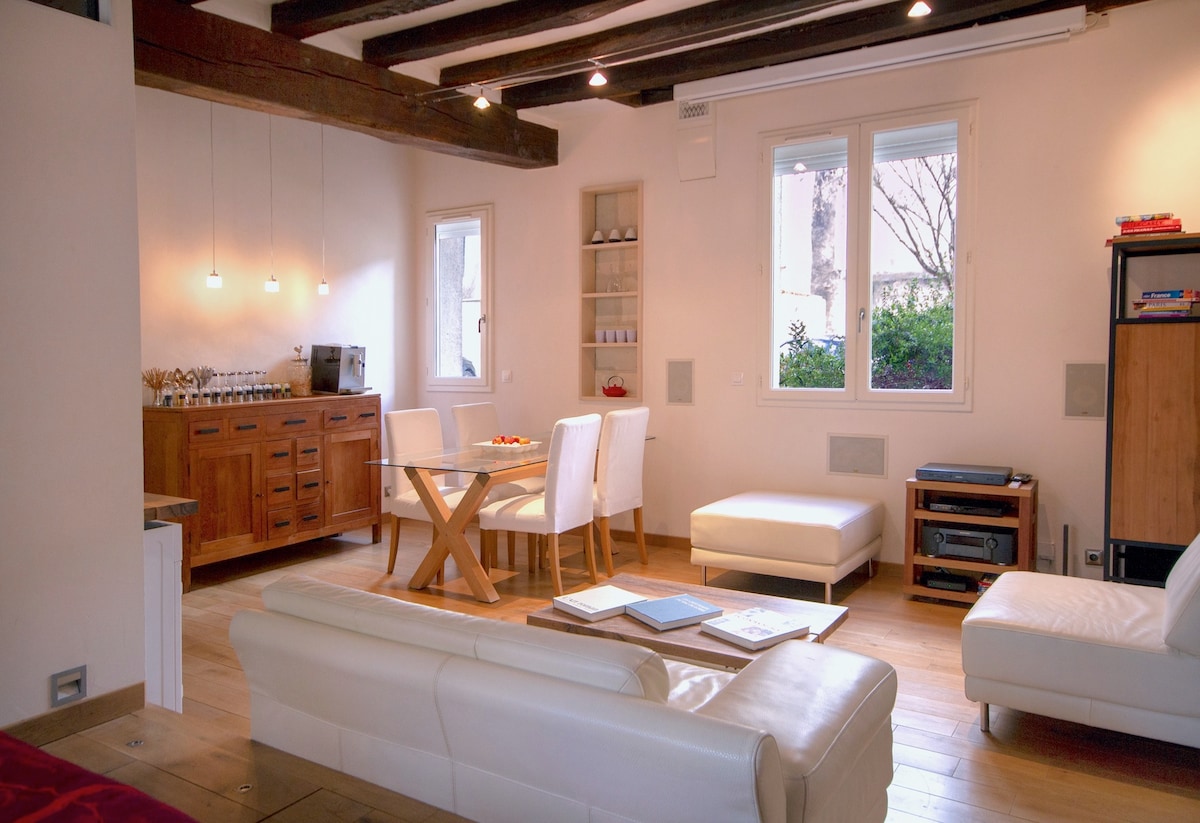 The "Jardin des Amandiers" is a rare apartment on the ground floor of an old 15th c. Manor of the Order of the Knights Templar. (not accessible to people with reduced mobility) It features a private parking, a great garden, a great living room, a great bed, a great freestanding bath, a great cinema screen... in the greatest calm right in the center of Tours.