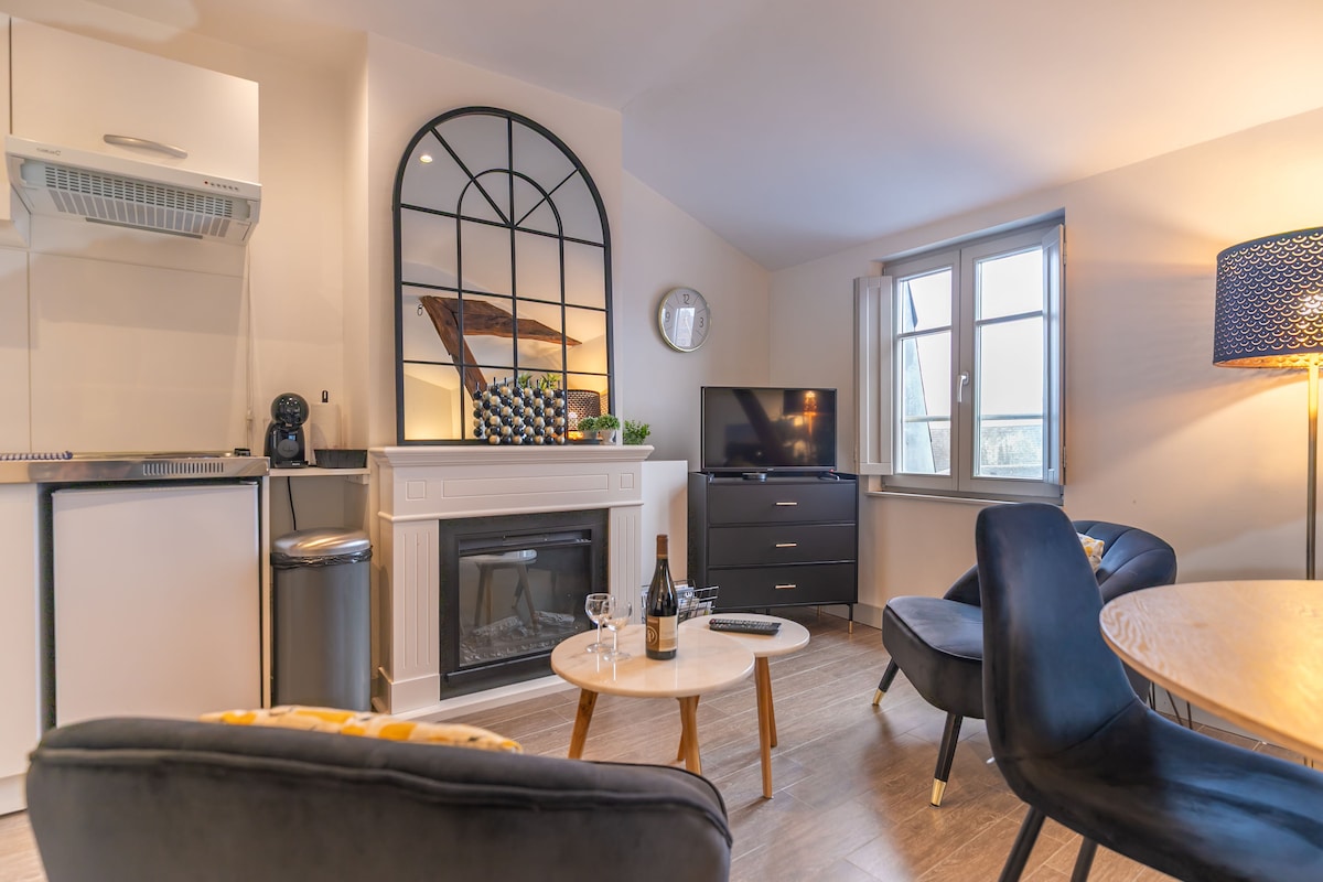 Appartement T2. 400 m de la gare, 2mins à pied du centre ville. stationnement gratuit, prêt de vélo possible. Déco soignée, mobilier de qualité, pour un séjour agréable ou voyageur d'affaires. - pièce de vie avec un canapé convertible - tv de 108 cm netflix - cuisine ouverte équipée: plaque induction, four/micro-ondes, air-fryer, cafetière, grille-pain, bouilloire... - chambre séparée, lit 160×200 et préparé. - grande salle de bain avec machine à laver - patio agréable pour petit déjeuner.