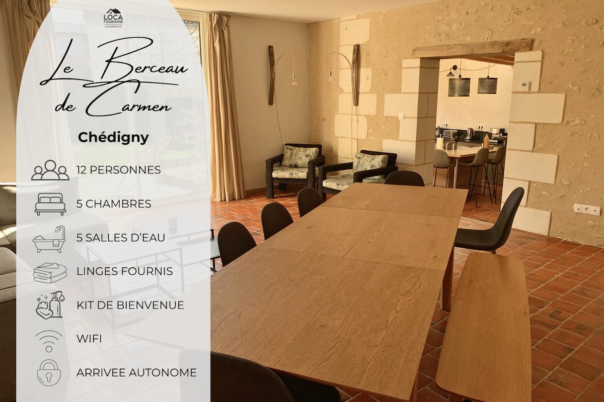 Juillet et août semaine uniquement du samedi au samedi Maison en pierre de 400 m2 tout près de Chinon pour 12 adultes et 2 enfants Piscine chauffée de 13 m par 5 de mai à septembre jacuzzi 6 pers Double terrain de pétanque,ping pong,billard,babyfoot,fléchettes 7 chambres (5lits 160, 1 lit 140 et 2 lits superposés ) literie haut de gamme et 4 salles de bains avec wc Pièce de vie de 100 m2 TV 2 mètres et cuisine équipée et plancha à l’extérieur Aucun vis à vis Draps et serviettes fournis