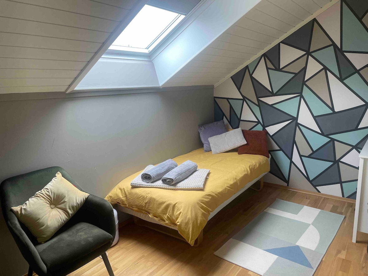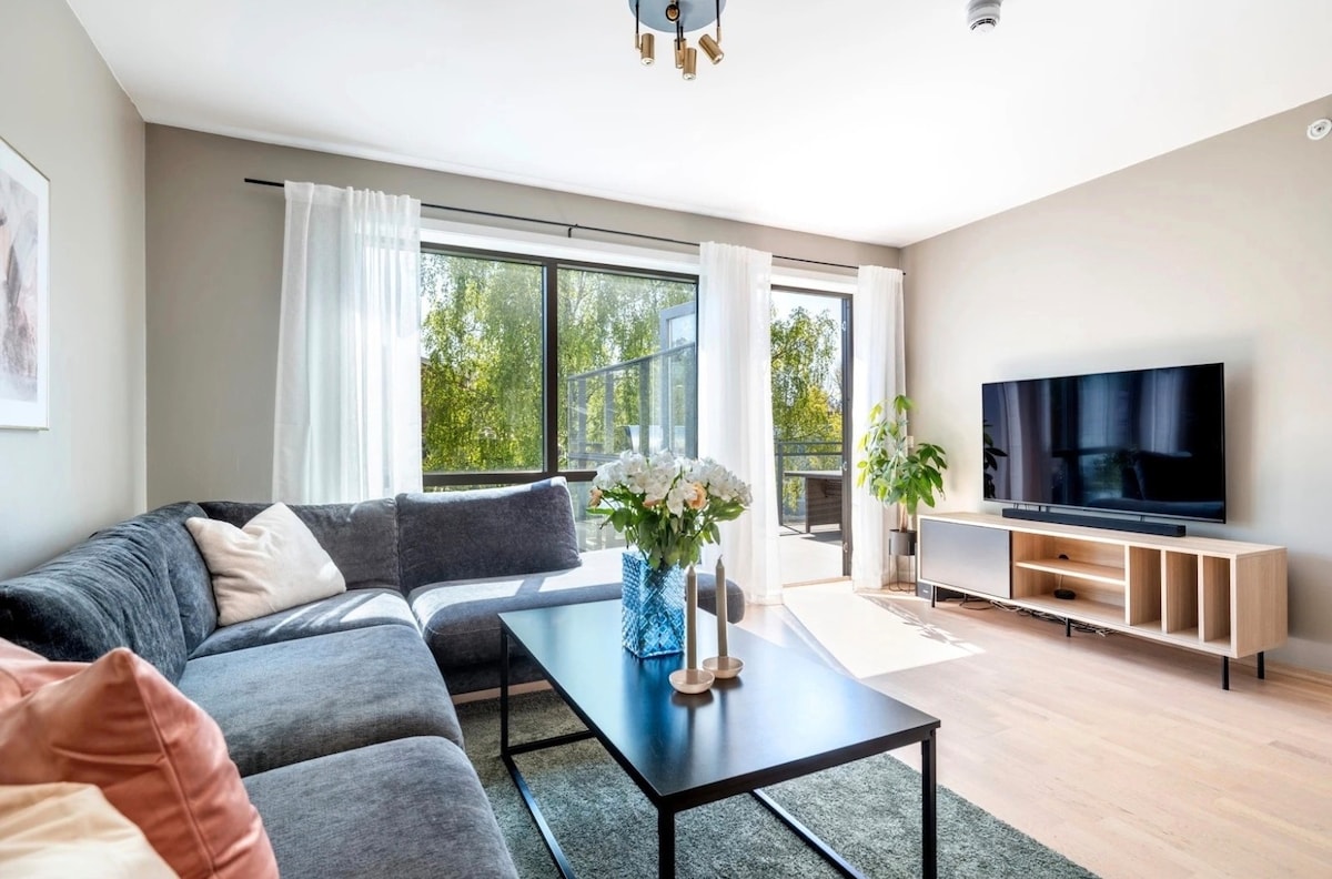 Leilighet med høy standard, romslig terrasse med sofa og spiseplass, takvifte på soverom, «waterfall» - dusj, vaskemaskin og tørketrommel. Fire minutter til bussholdeplass. Sengen er 140 cm, så skal man være 2 bør man være et par eller veldig så gode venner :) Mulig å leie parkering. Anbefaler å laste ned Aimo Park appen på forhånd, da den kan være vanskelig å laste ned via 5G nettet. Leiligheten ligger ikke «nær innsjø», men har foreløpig ikke greid å fjerne det fra AirBnB.