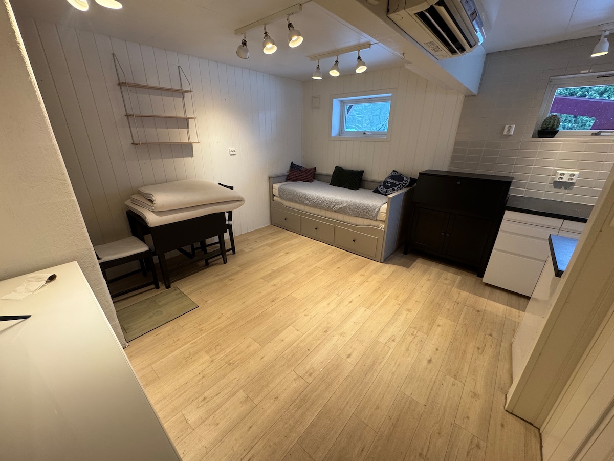 Hybelleilighet, liten med egen inngang, komplett med bad og kjøkken, inkludert sovesofa som kan slås ut til dobbeltseng. Sentralt i Ski. 900 meter til Ski sentrum med Ski Stasjon. 200 meter til nærbutikk. Stille og rolig villastrøk. Parkering like utenfor hybelen på egen tomt. Stedet passer ypperlig for en person, men kan også passe for 2 personer for kortere opphold, 2-3 dager.