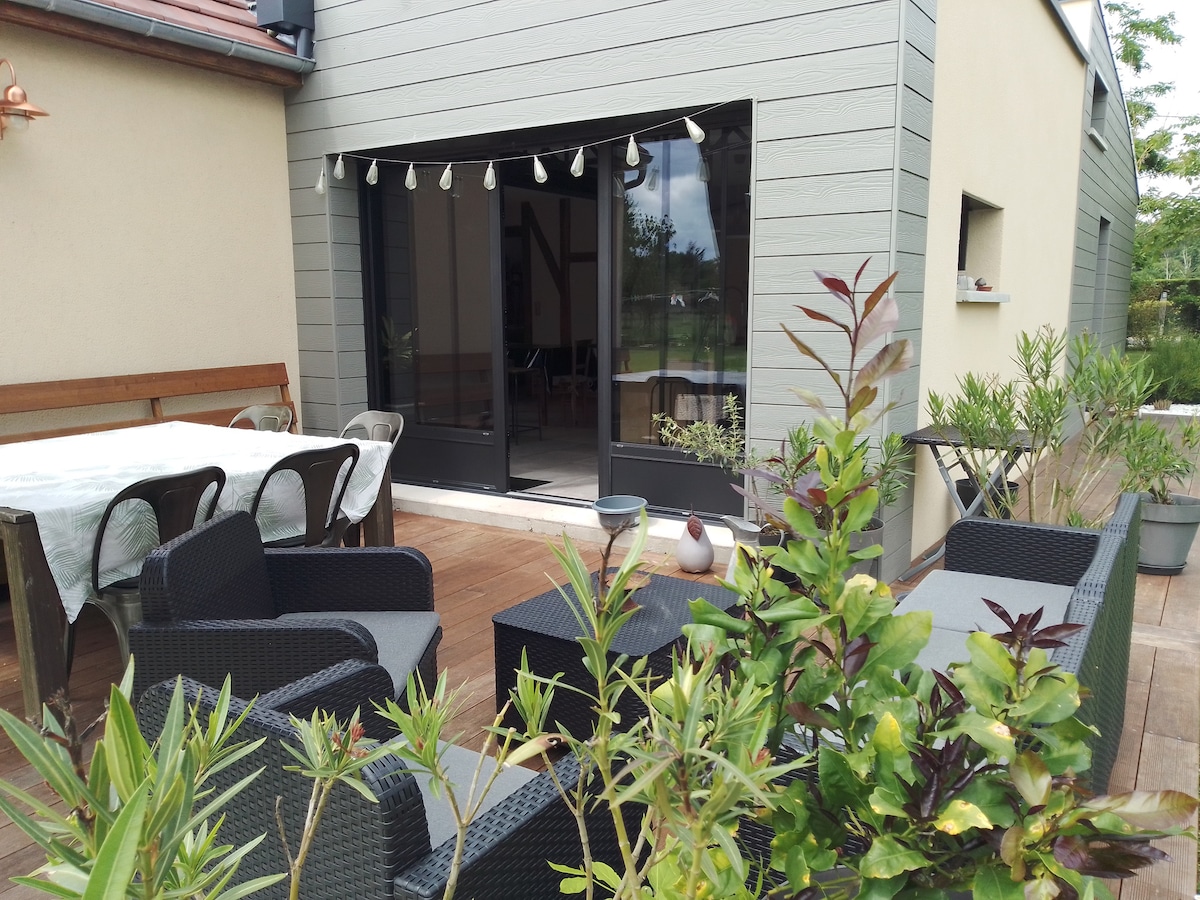 Notre maison en bois climatisée est adaptée aux vacances d'une famille, y compris votre chien. Vous pouvez aussi y organiser votre réunion d'équipe . 2 chambres dont une avec deux lits une personne, une grande salle de 45M2 avec cuisine équipée, lave vaiselle, lave linge séchant et des WC salle de bain. Un baby foot et un terrain en herbe cloturé vous permettront de profiter avec vos enfants, en toute sécurité, y compris de la terrasse en bois. 2 chèvres naines vous accueillerons ;)
