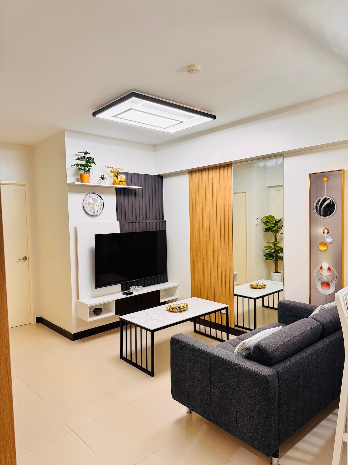 Relax with the whole family at this peaceful place to stay Bedroom Double size bed with Foam Mattress 4 large pillows 1 comforter + linen Smart Tv with Netflix Wifi Side table Aircondition Living/Dining Sofa 2-seater Dining table and chair Refrigerator Microwave oven Induction cooker Rice cooker Kettle Pot Mugs / plates / spoon&fork Trash Can 2-Mirror Bathroom Bidet Mirror Sink Water heater Shower telephone Trash Can One-time set up and freebie 2bottled water 1tissue roll SELF CHECK-IN