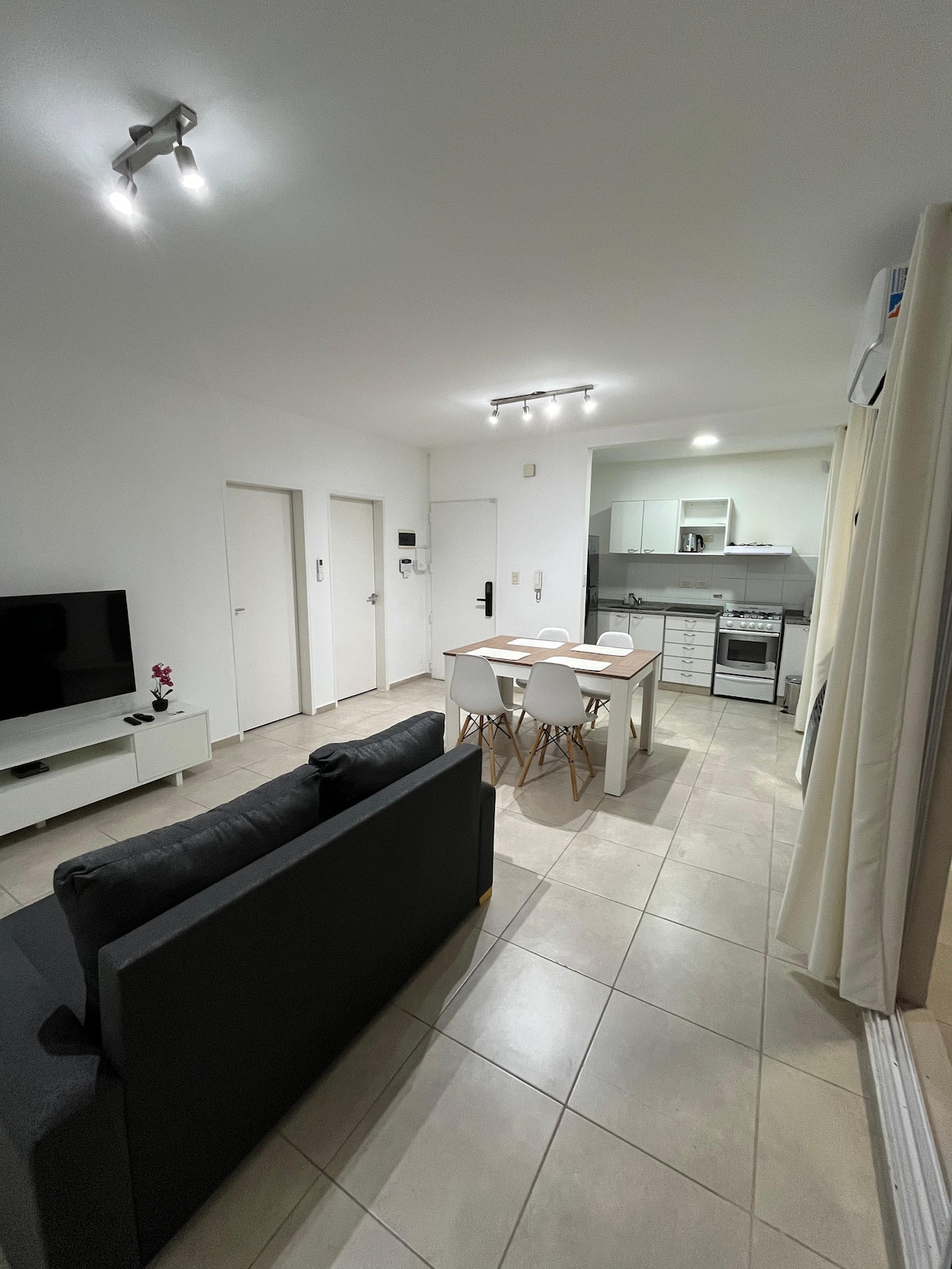 Alojamiento tranquilo y céntrico, ubicado en la planta baja. A sólo 4 cuadras de la estación. Frente a supermercado, farmacia, heladería, etc. Seguridad en la entrada las 24hs. Cocina completa, lavarropas, tender y plancha. Baño con ducha, easy videt, jabon shampoo, acond y secador de pelo. Aire acondicionado frio/calor. Cama matrimonial, TV plana y amplia cajonera guardarropas. Con un espacio privado al aire libre y parque verde con piscina de uso común. Cochera privada bajo techo incluida.