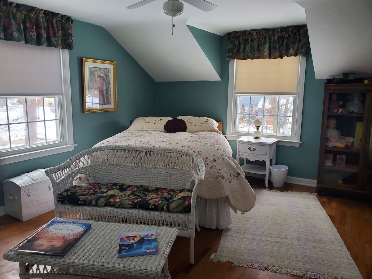 The NE bedroom (Option a.) is a full size-double bedroom w/TV area & dedicated workspace. (Options b. & c. will be locked off & vacant during your stay). Message the host if you prefer one bedroom w/a different sleeping configuration. Options are b. NW one-bedroom queen w/fireplace & walk-in closet, or c. Midwest one bedroom w/two-XL twins + toddler bed w/ walk-in closet. THIS IS A NO WEAPONS ZONE.