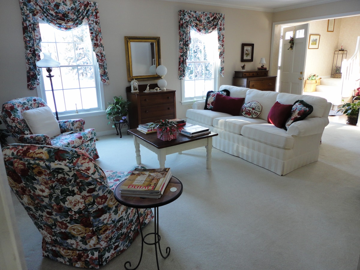 Enjoy a cozy, very private stay in the garden level apartment of our home, on a 10 acre beautifully wooded, wildlife filled, property. This is a one bedroom suite with a sleeper sofa, allowing up to four guests . The kitchenette includes a refrigerator, microwave, and coffee bar, and the tv has streaming for your viewing enjoyment. WIFI and workout area to start your day! The patio area includes an eating area, and hot tub, all very private.