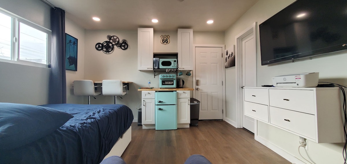 Unwind in this beautiful hilltop studio retreat located in the heart of Windsor Hills, just 10 minutes to SoFi Stadium, The Forum, and the YouTube Theater, and only 15 minutes to LAX. Perfect for solo travelers or couples looking for a cozy, artistic space with personality. Please note: • This is a second-floor unit with no guard rails; not recommended for small children • Street parking only • It’s a cozy, older apartment, expect character, not perfection • No pets, no smoking, and no parties