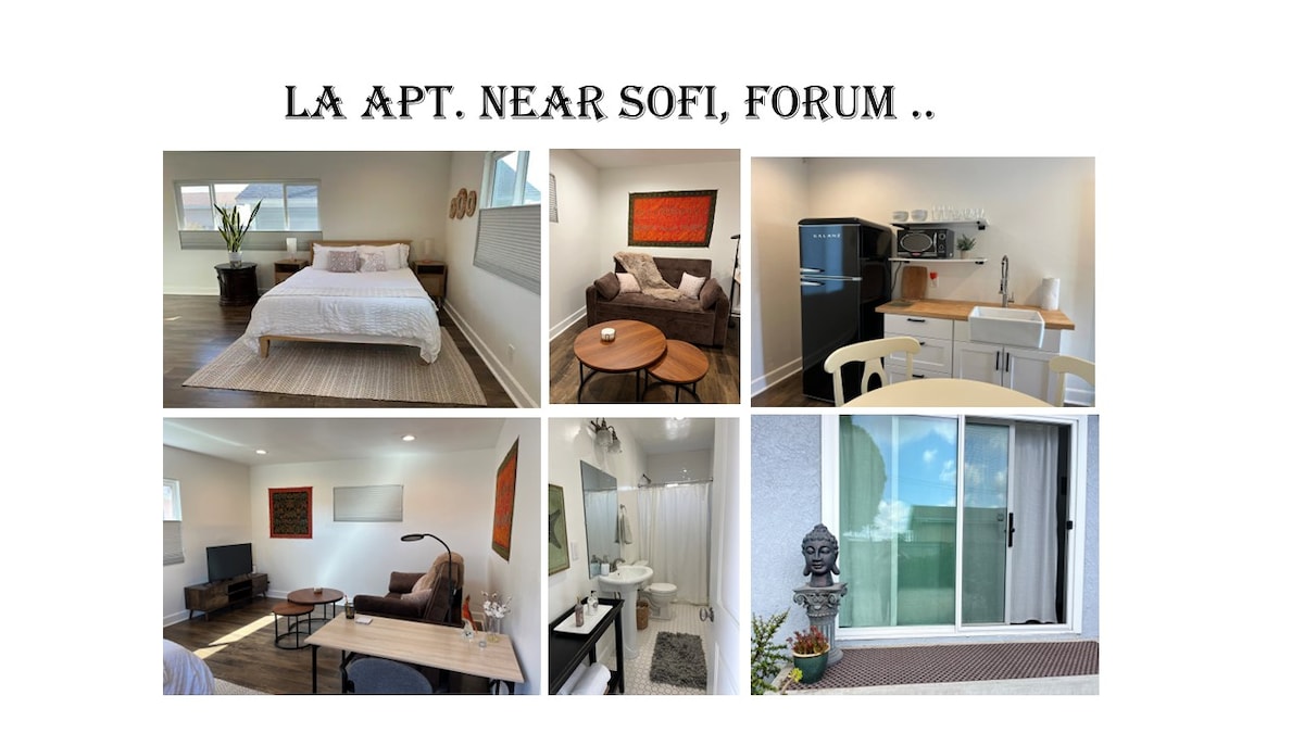 Unwind after an exhausting day shopping, at the beach, or indulging in one of the cities many attractions!Welcomed by an elegant space with a comfy couch and widescreen TV, and an inviting bed. -Guests may use entire space of their unit. Unit is not shared -security cameras on the outside of the building -Please no noise or congregating in back of property or driveway out of respect for our other guests, keep in mind quiet hour after 10pm -please ask permission or if you have any questions about using anything outside of the unit, you can do this through Airbnb message or text - parking for one standard size vehicle The building is owner occupied so we live on premises and are very easy to reach for any accommodations you may need The apartment is less than 3 miles from Fabulous Forum, the NEW SoFI stadium, and beaches. Shopping, restaurants, Whole Foods, a golf course, and a movie theatre are also nearby. LAX is eight minutes away. Uber and Lyft run constantly in this area due to the close proximity of the airport. You won’t wait for more than a few minutes. Parking on premises for one standard size vehicle, otherwise street parking is available. DoorDash and Postmate apps can be downloaded on your phone for food delivery and grocery delivery options from all over surrounding areas Driveway is very narrow and cannot accommodate oversized vehicles. There are video cameras on the exterior of the building for added security The apartment is less than two miles from Fabulous Forum, the new Rams stadium, and beaches. Shopping, restaurants, Whole Foods, a golf course, and a movie theatre are also nearby. LAX is eight minutes away.