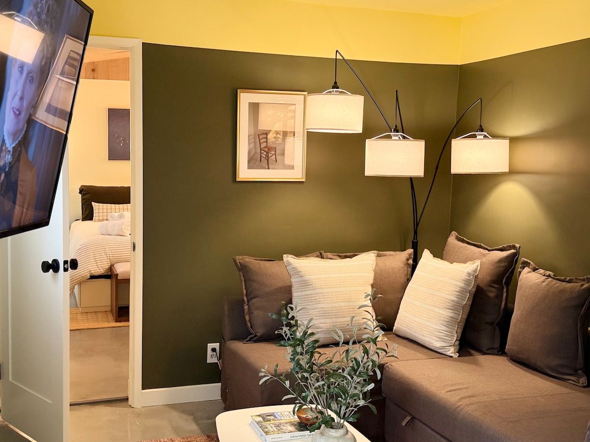 A Simple, Cozy Retreat — Just Like the Old-Time Traveler’s Quarters This tiny yet inviting guesthouse/studio offers a nostalgic nod to classic travel stays. Guests can relax in a thoughtfully designed space featuring kitchen basics and amenities, central air and heat, a ¾ bathroom, and a smart TV with streaming services. Perfect for a restful stopover or a minimalist getaway.