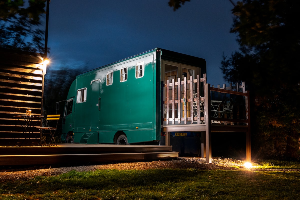 Welcome to Gee Gee, our 90s Race Horse Transporter. All our units here at The Layby Lincs have a king size bed, AC for hot and cold, an outdoor covered kitchen area, a private bathroom cabin and your own wood fired hot tub. We are closer to a luxury holiday cottage than we are to camping. Gee Gee has an 3ft stock fenced garden for supervised off lead time with your furry friends. Why stay somewhere boring when you can stay somewhere memorable.