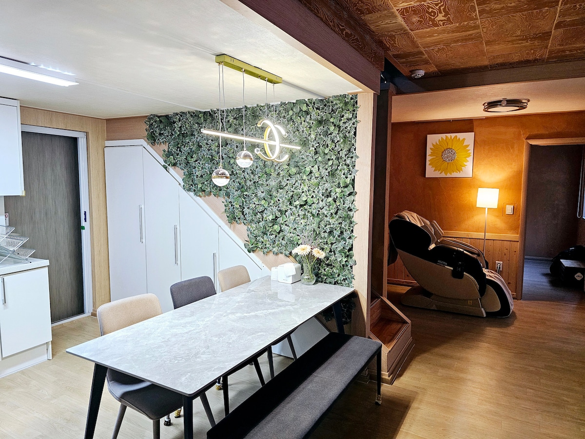 Hello! SorokSorok is a modern hanok stay located in Chuncheon, Korea. We offer the entire house and a spacious garden for a “complete rest.” You can enjoy picnics, gardening, reading, music, outdoor dining, stargazing, and bubble play. For an undisturbed rest, enjoy the private space of the entire house 🖤 The recommended number of guests is 4, but it can accommodate up to 6 people. (Single beds: 2, Queen bed: 1 + additional bedding upon request)