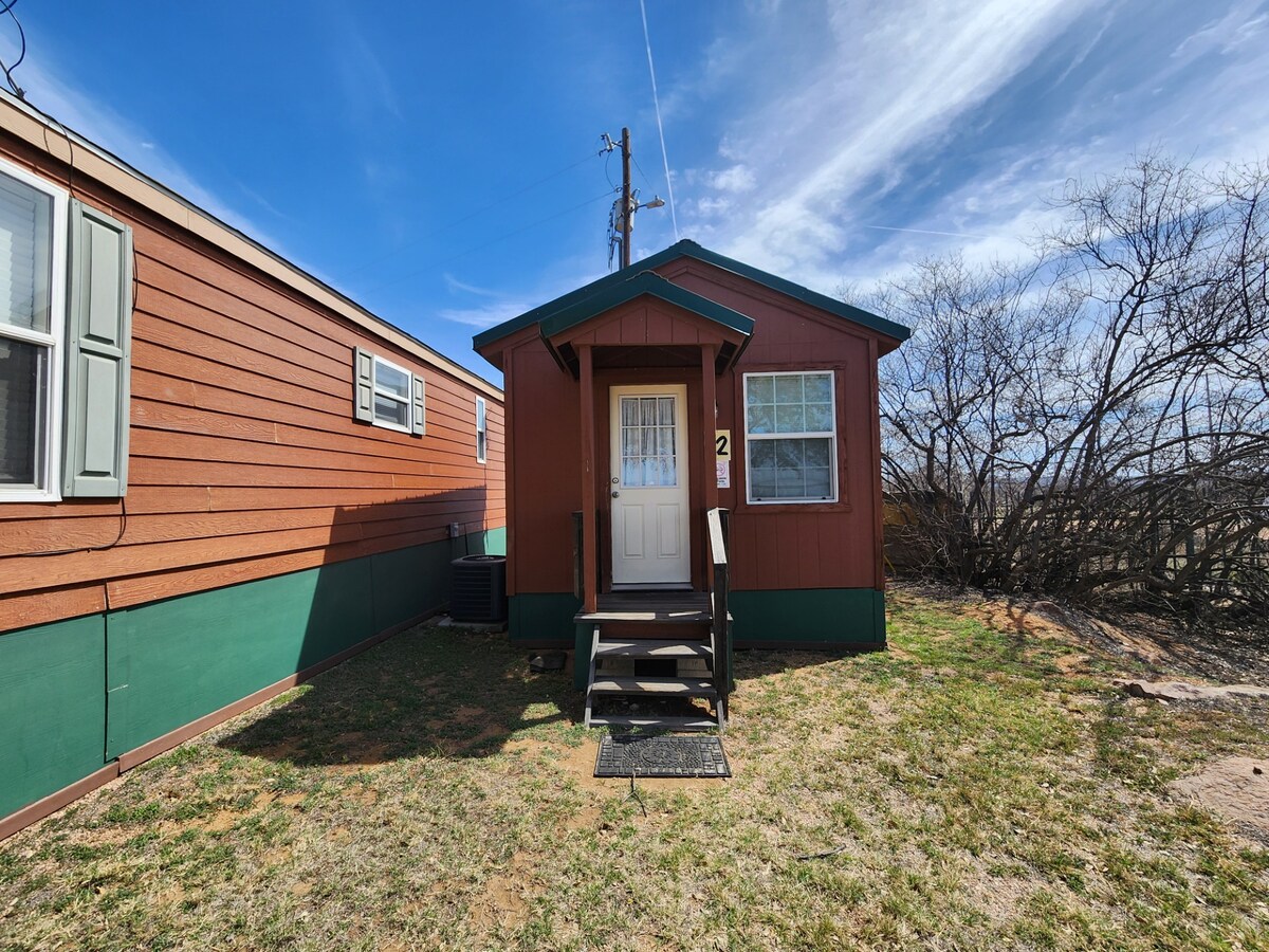 Our Rustler's Crossing Cabin is nestled in the woods amongst large oak trees. If your looking for a very private secluded stay, this is for you! Parking is 130 feet from cabin. Plenty of room to park your trailers if you are mountain biking or boating. You can enjoy the porch all night if you like howling at the moon and stars. Enjoy the goats, Don Juan is the main man, Pedro is the chief rabbit. Cabin is equipped with full size refrigerator, large country sink and a two burner stove.