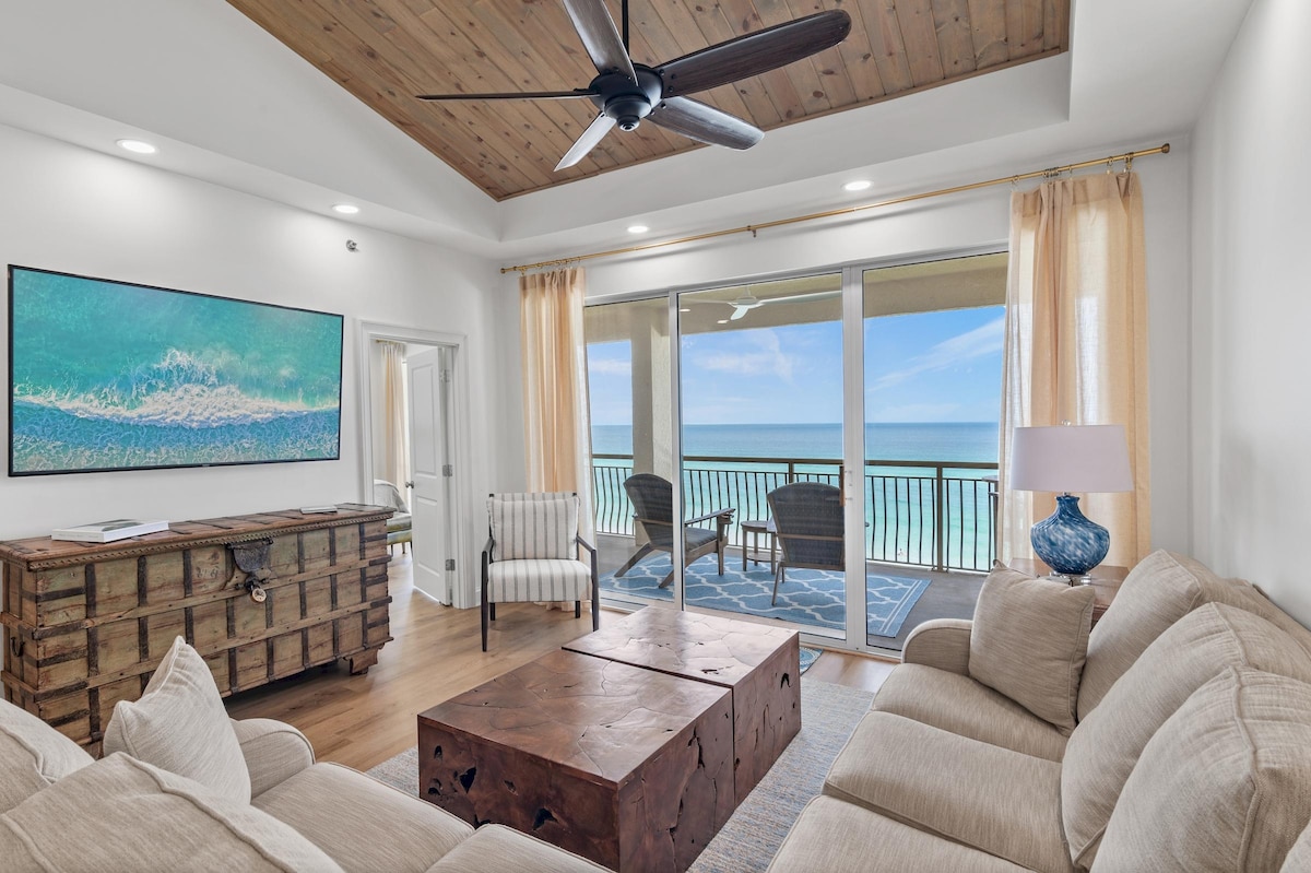 Newly renovated mid-century modern luxury condo with breath taking gulf views, walking distance to Pier Park and Gulf world and loads of amenities such as heated pool, hot tub, GYM and mini movie theater. Please check out our other listings for 2BR and the studio. Building is situated across the street from Sharky's. Property is beach front but not on the beach.