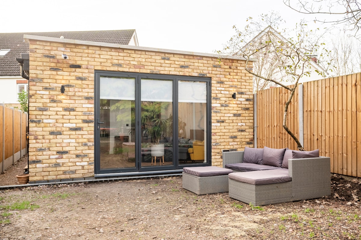Brand new large studio apartment finished to a very high standard at the rear of our garden with a fully functional Kitchen,Bathroom and with a spacious bedroom / living space with a dedicated workspace and outdoor furniture. We are located in the lovely town of Loughton, walking distance to Epping Forrest and 30-35 minute drive to Stansted Airport and 1.5 Mile to Loughton Station. Free parking on the front drive, complimentary WI-FI, 65” Smart TV, Bluetooth Sound System Speakers.