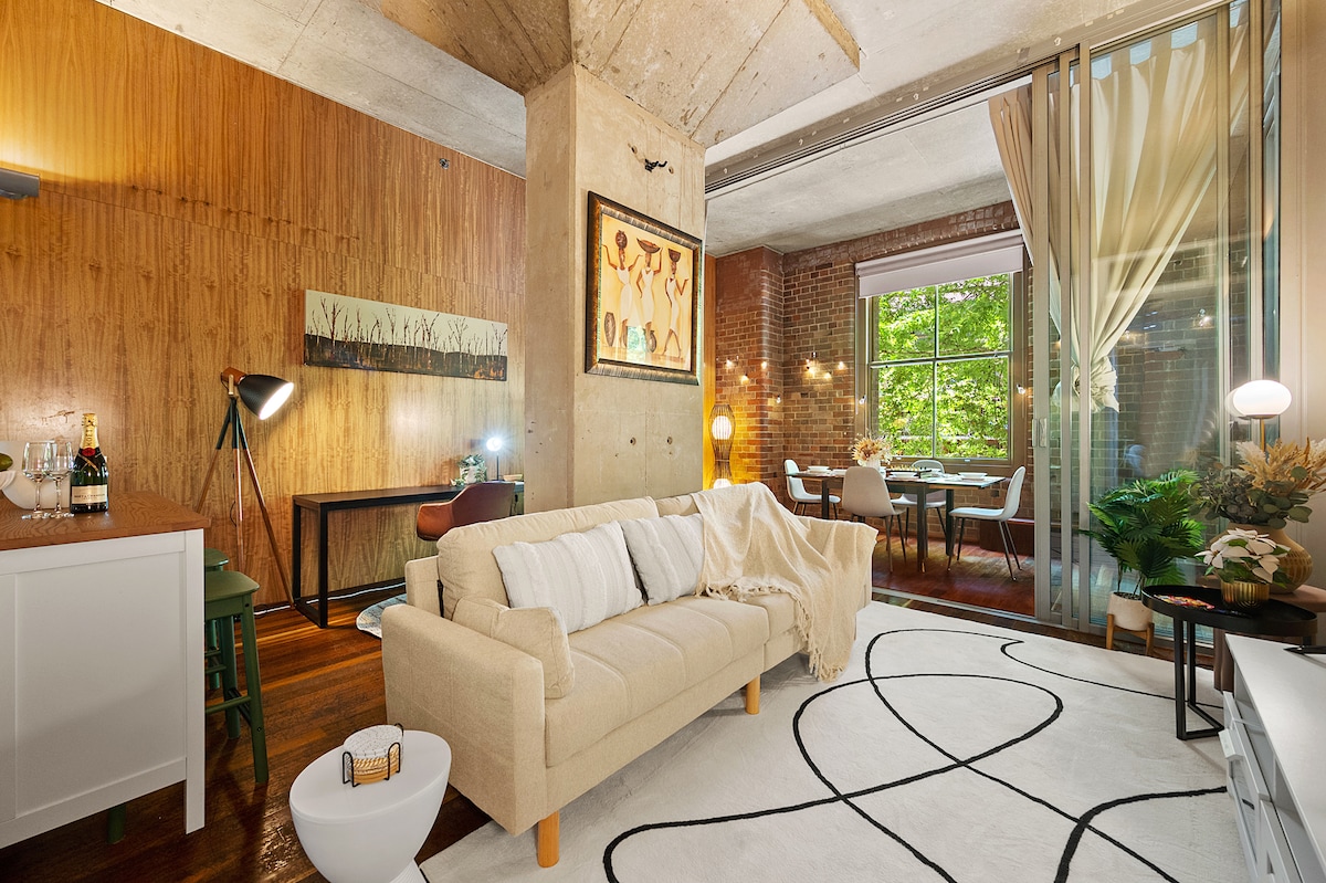 Welcome to Frank’s Lofts, a stylish, light-filled apartment with a stunning 5-metre high window overlooking a lush, peaceful garden. Designed with a nod to Union Square, it blends mid-century modern design with a warm, cosy vibe that feels like home. Wake up to natural light, enjoy slow mornings with a garden view, and unwind after a day out. You’ll be moments from Camperdown Park, the University of Sydney, and Newtown’s buzzing cafés, bars, and boutiques, with the CBD just a short ride away.