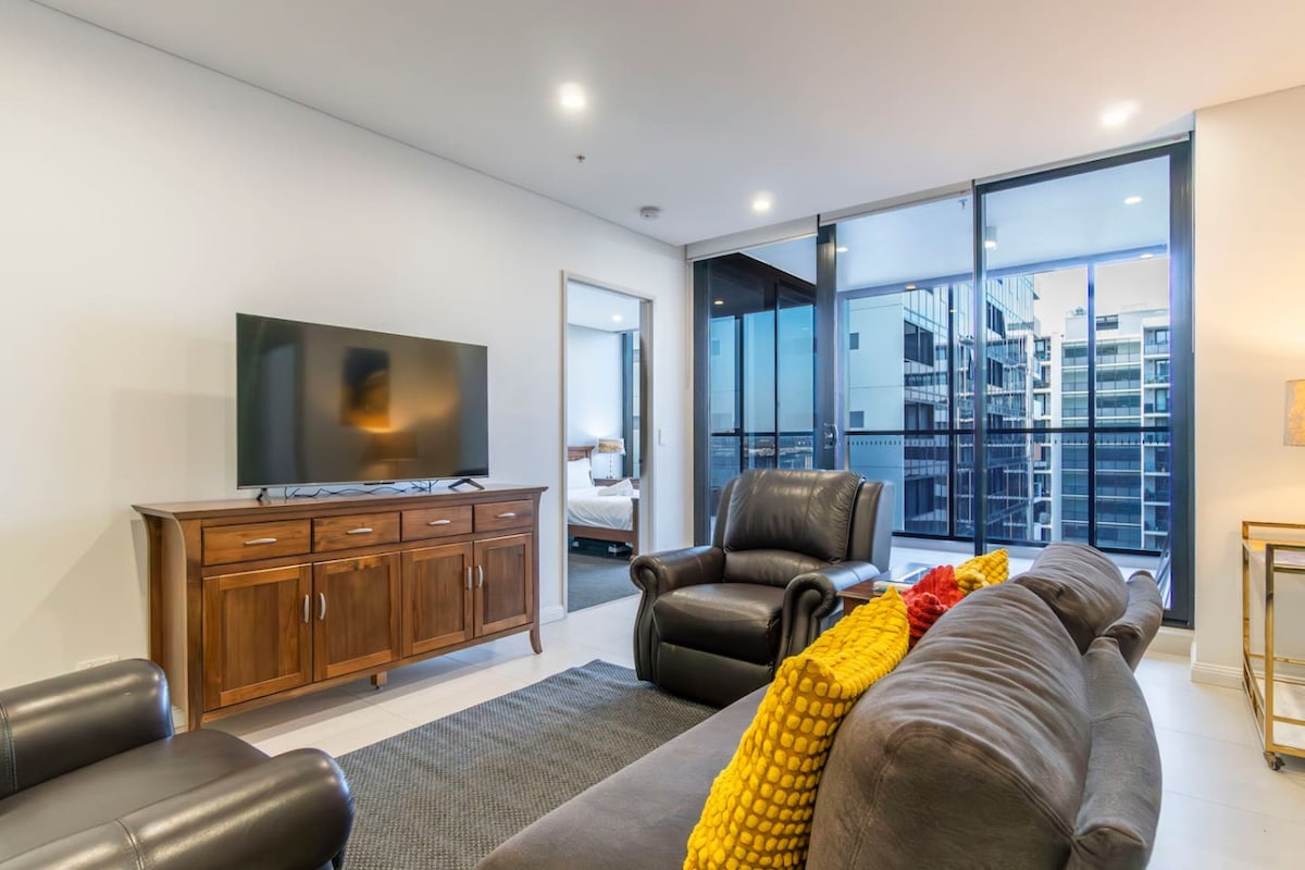 Luxury 3-Bedroom Apartment with Iconic Sydney Views This stylish, fully furnished apartment offers stunning views of Darling Harbour, Barangaroo, and the Sydney skyline. Enjoy the perfect city escape with top amenities and a prime location near CBD and Darling Harbour. **Highlights** Spacious dining and living area 3 bedrooms with Sydney city views Private balcony Fully equipped kitchen 2 bathrooms + powder room A/C, secure building, lift access Pool, gym, dining Paid parking