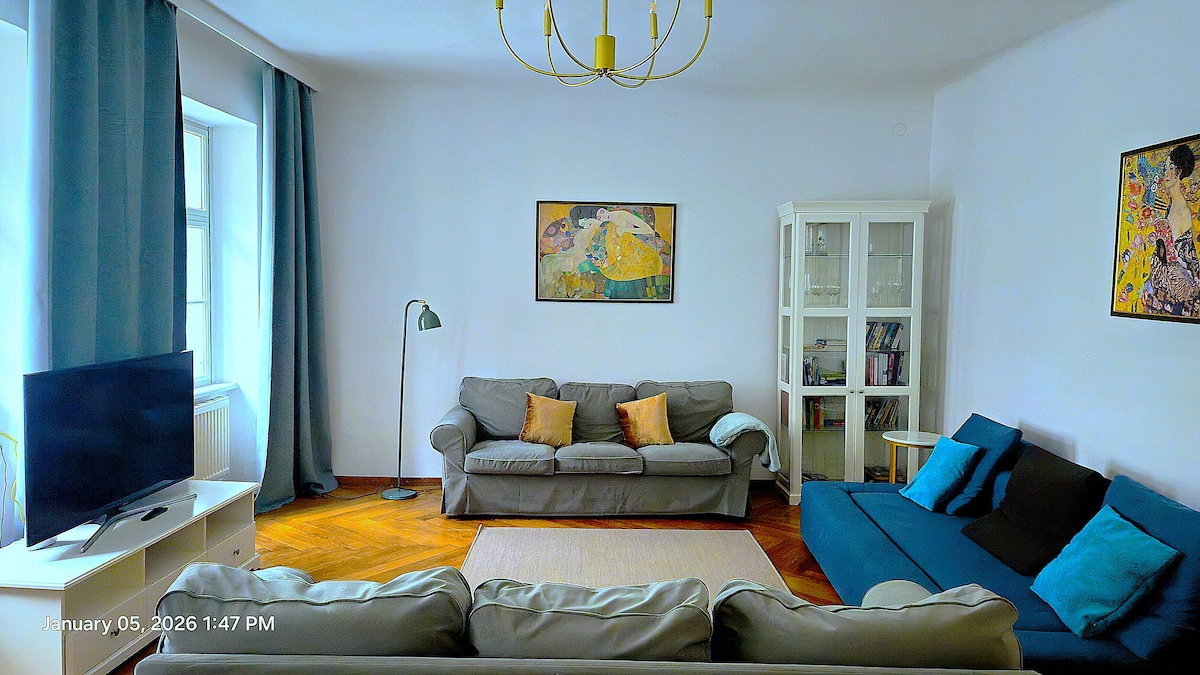 160 m² spacious vintage Viennese apartment (from year 1754) with (5 rooms) 3 separately accessible bedrooms, a large living room + 1 Kitchen, 1 bathroom, 2 toilets and a store room. In the city center, yet in a quiet lovely cobblestone sidestreet in the walking only zone. Only 30 meters from Graben & 300 meters from Stephansplatz. You'll be neighbors to Prada, Armani, Chanel and Louis Vuitton :) You would be pleasantly surprised by the sound of horse steps. Beherbergungsstätte MA37/99105-2024-1