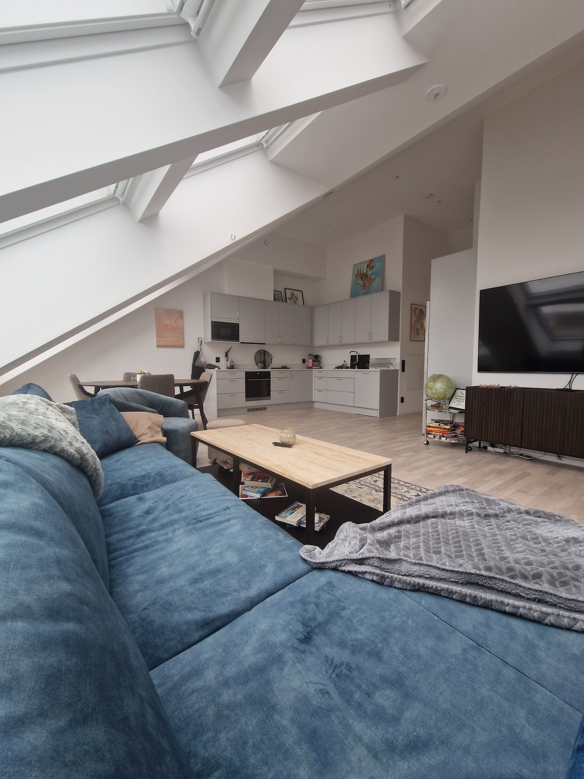Weekly rental only Sun-Sun 70 square meter attic apartment with open plan, fireplace and sea view in the middle of Visby city centre. Central but still quiet location. 18th century house with wooden floors, ceiling height of 4 meters and exposed beams. Beautiful view of the roof ridges, and the sea. Stylish throughout with light walls and ceilings, white-glazed wooden floors, underfloor heating and window sills in Gotland limestone. Sheets and towels are not included.