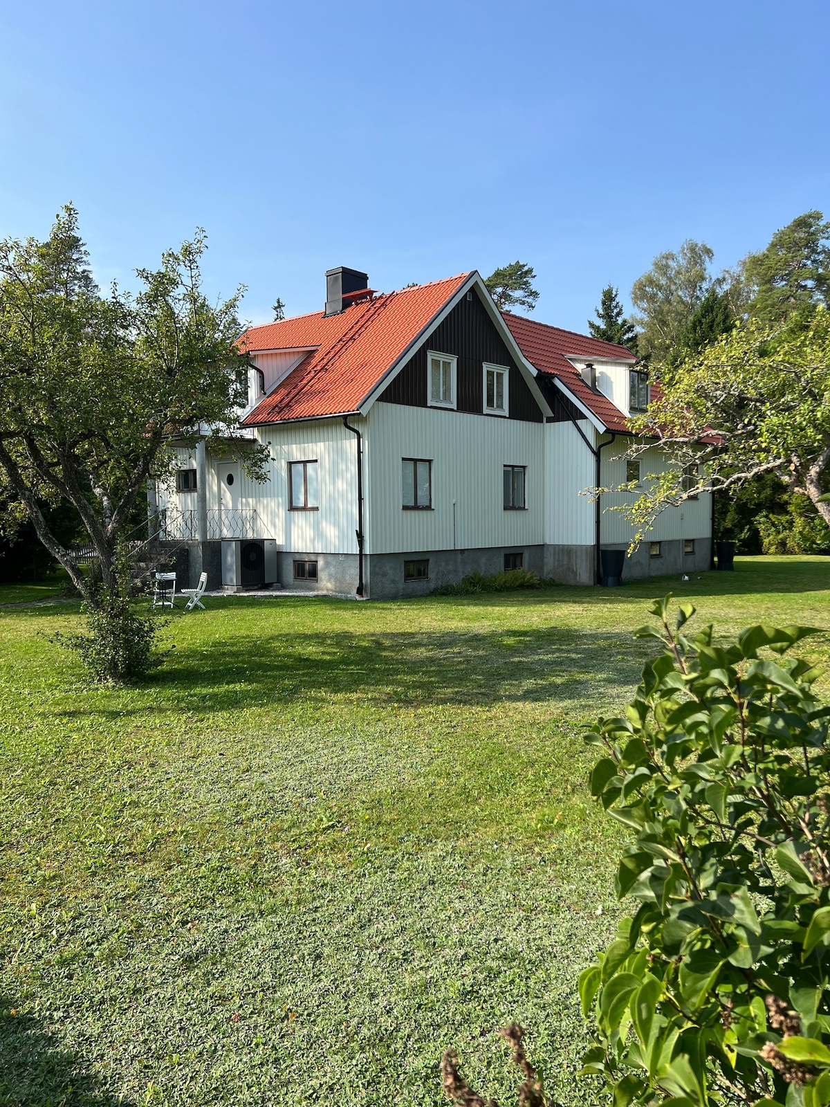 9 rok, Två nybyggda badrum ett på varje våningsplan . En separat toalett nere. Totalt tre duschar, tre toaletter. Stort kök spis kyl micro bryggare diskmaskin. Tv rum med kamin, Uterum o grill finnes, tvättmaskin Stor lantlig trädgård med vackra vyer trädgårdsmöbler (nötkreatur i hagarna runt om) Ingen rökning inomhus, Önskas lakan/handduk 100kr/pers Städning erbjuds 2800 kr bokas i förväg 7 km till havet, restaurang och bad. Laddbox till bil finns OBS veckorna 27-32 veckovis bytesdag Lördag
