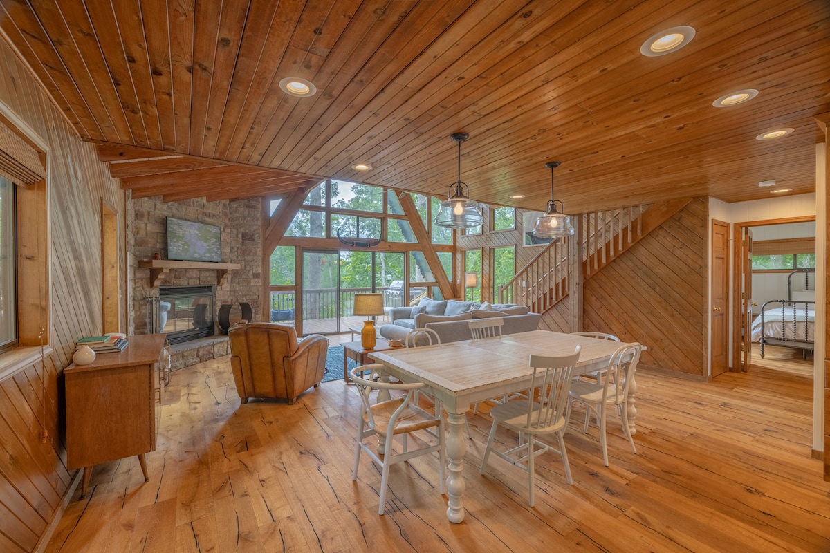 Come stay at "Redbird Cabin" our lakefront 3 bedroom A-frame home right on the water with beautiful lake views from the family room. We have plenty of space for families and friends with everything you need to enjoy your retreat. Our massive outdoor area makes for a great space to BBQ, relax, and sit by the fire pit. Located in a gated community within Innsbrook resort (an hour from STL), you'll love the community seasonal pool, restaurant, golf course, gym, playground, and hiking trails!
