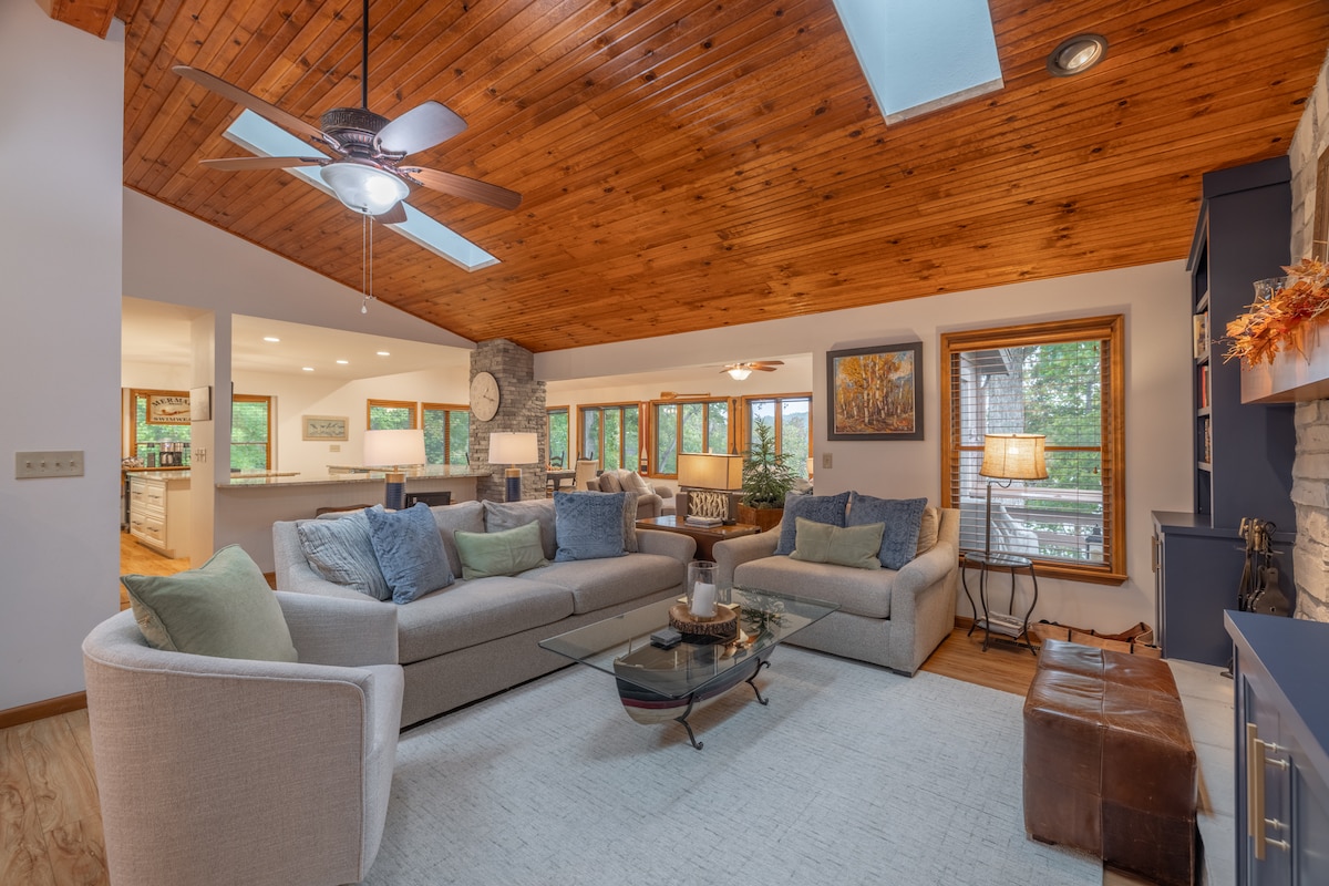 Minimalist flair meets contemporary rustic living at this newly constructed treehouse perched on one of the highest points in Innsbrook! Perfect for a large group, multi-family or single-family getaway. Open floor plan with two living rooms and plenty of dining space. Enjoy the breathtaking views of the surrounding rolling hills and valley below through the floor-to-ceiling windows and enjoy a huge, floor-to-ceiling stone fireplace. You'll feel like you're on a mountaintop!
