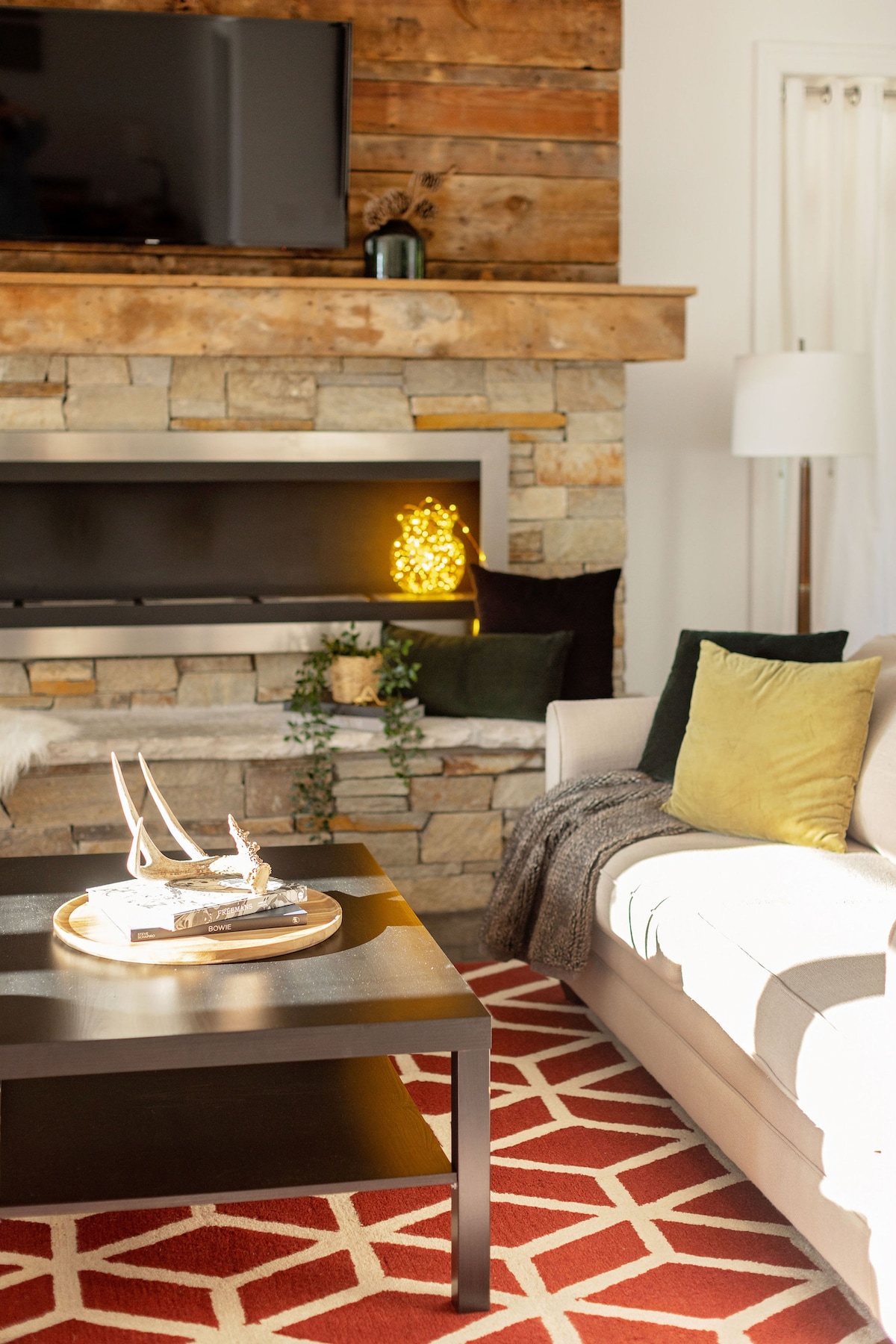 • Stunning living area with a wall of oversized windows, luxury furniture, and a floor to ceiling stone fireplace