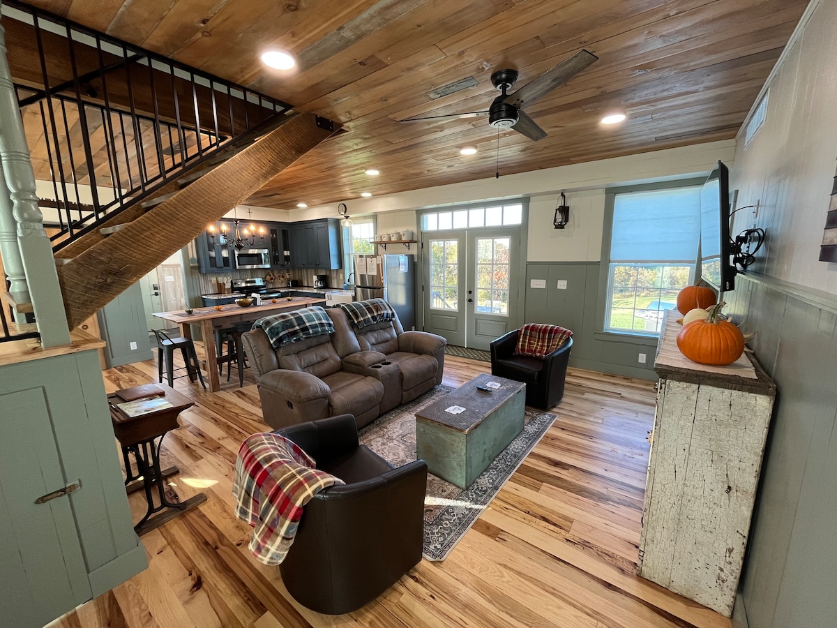 Very private country setting just 2 miles south of interstate 70. You’ll likely enjoy some wildlife sightings. Nice private patio seating. Cabin feel, spacious, has full kitchen. Murphy bed in the living room (very comfortable) provides an extra Q bed if needed, otherwise it’s out of the way. Internet was weak so affected some reviews but is super fast now. Nearby destinations are Cedar Lake Winery, Big Joel’s Safari, Long Row Lavender Farm, and Pumpkins Galore.