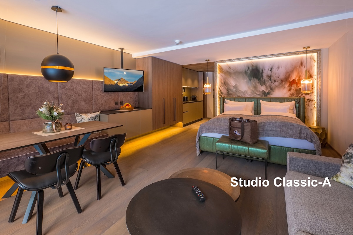 Erleben Sie die Ötztaler Berge in all ihren Facetten: fest, flüssig, gasförmig und glühend. In Ihrem Genussurlaub lassen wir die vier Elemente für Sie tanzen – das lodernde Feuer, die Klarheit des Wassers, die fruchtbare Kraft der Erde und die Freiheit, die bei uns in der Luft liegt. In unseren modern designten Studios – mit ausgezeichnetem à la carte Restaurant und echter Tiroler Gastlichkeit.Genieße den Glamour dieser stilvollen, gehobenen Unterkunft.