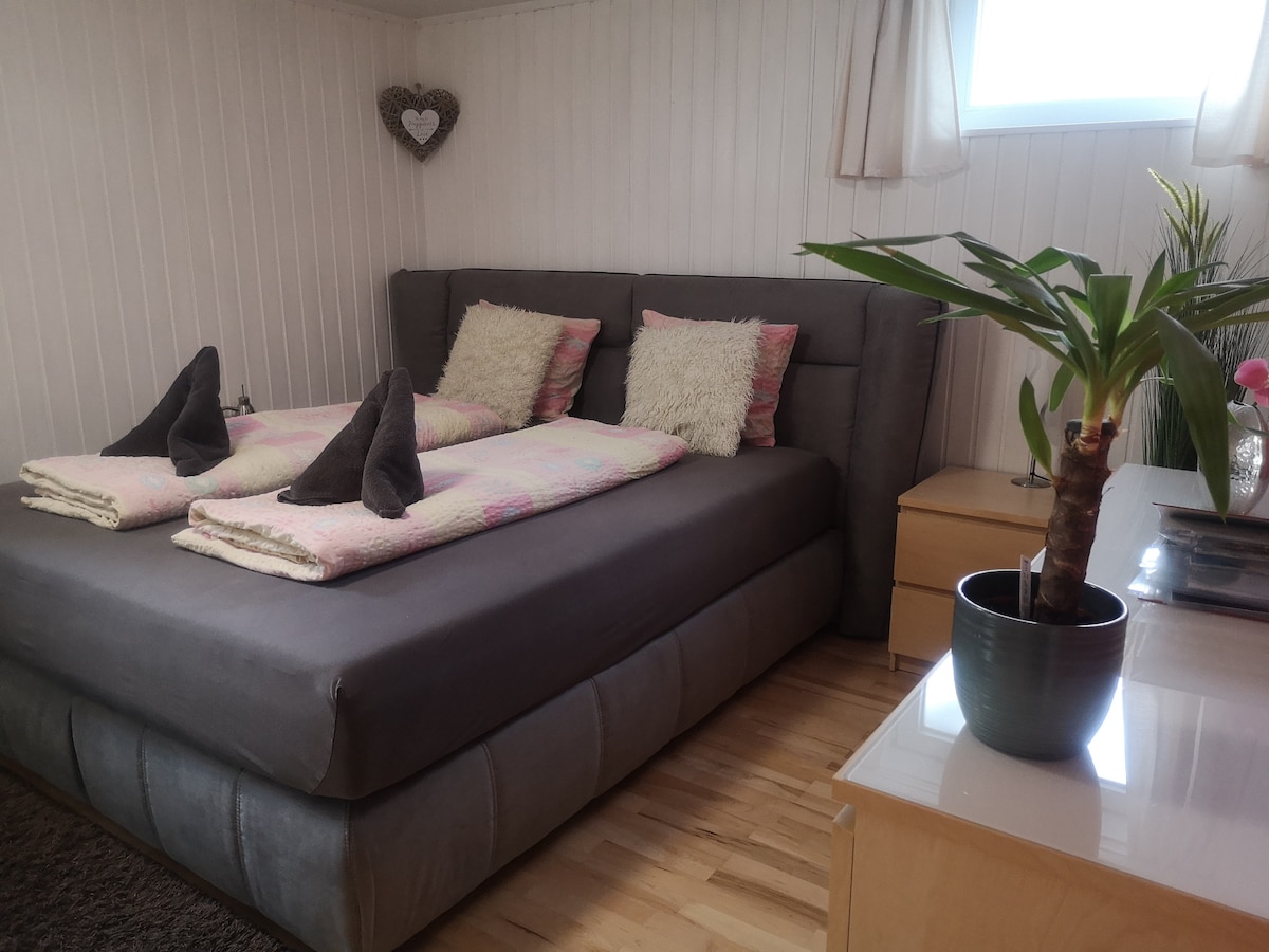 Diese besondere Unterkunft hat einen ganz eigenen Stil. Die modern, mit allem Komfort ausgestattete ebenerdige Wohnung liegt im südwestseitigen Trakt in einem Einfamilienhaus im Landhausstil. Es finden 4 Gäste in einem Doppelbett und auf einer Doppelschlafcouch bequem Platz. Die Terrasse mit Gartenanteil lädt jederzeit zum sonnen, chillen und grillen ein. Unsere Gäste genießen Natur pur direkt am Jakobsweg mit wunderbarer Kulturlandschaft, riesigem Waldgebiet und tollem Bergpanorama.