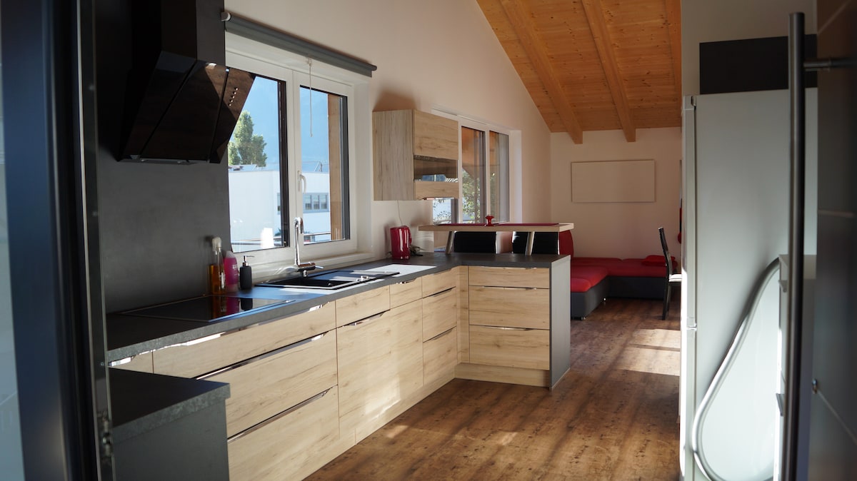 Bright large studio in a quiet neighbourhood and central location. Within 10min walking distance you'll find groceries stores, train station, restaurants and city center. The apartment is perfect for a max. 6 person group. The fully equipped kitchen, living and working space as well as the wonderful terrace make it an excellent choice for longer stays. We are private room landlords and offer apartments in our own house. My name is Angela and I will always be on site during your stay.