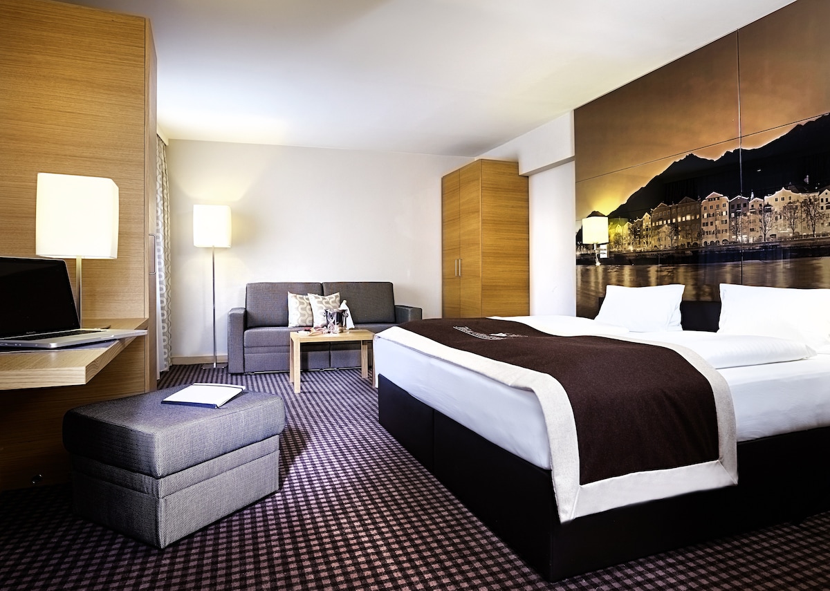 Our Classic category stands out with its modern and high-quality furnishings and perfectly reflects the hotel environment of the Alpine capital through special pictures of the city or high-quality leather headboards. This category is available with a view of the mountain and/or river or an inner courtyard location. You are guaranteed the premium two-part quality sleep system in this category.