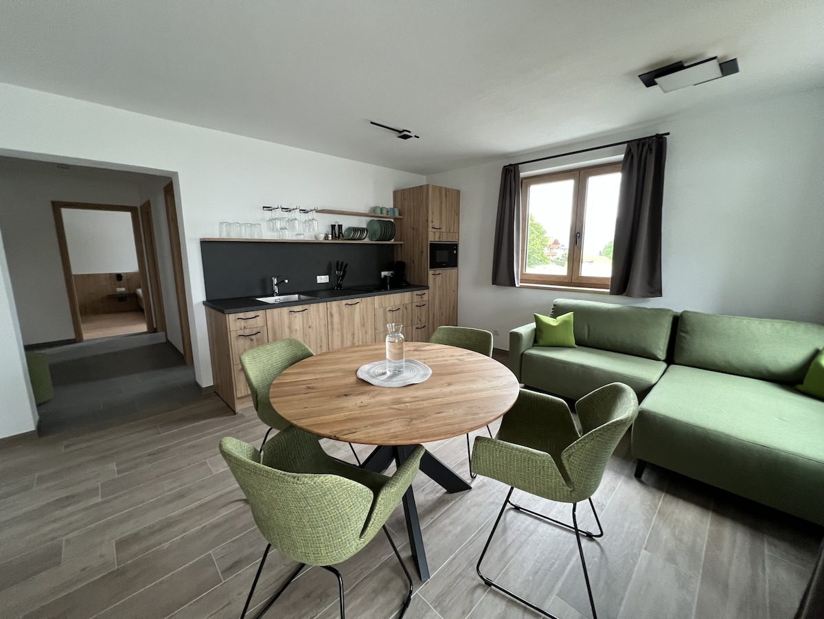 ruhige Lage und atemberaubende Aussicht in die Natur Genießen Sie Ruhe und Freiheit. Lassen Sie sich vom freien Weitblick über die Felder in die umliegende Bergwelt verzaubern. Sie werden entspannen, Kraft tanken und Ihren Urlaub in vollen Zügen genießen. Unsere 50 qm helle, lichtdurchflutete Terrassensuite verfügt über ein King-Size-Doppelbett, einem Schlafsofa, einen Flachbild-TV mit Apple TV, Essbereich und einer voll ausgestatteten, sehr großzügigen Küche.