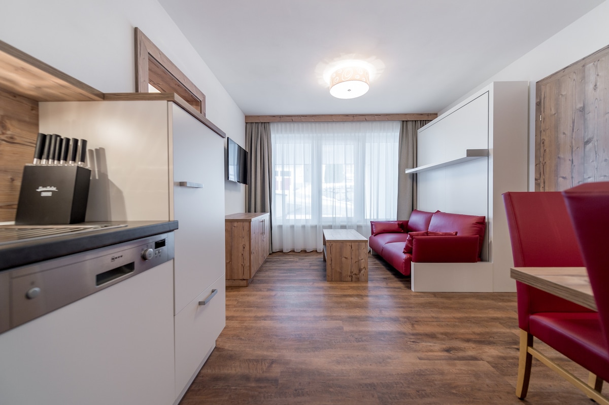 Deluxe Studio für 1-3 Personen - 26-33 m² - mit Balkon/Panormasitzfenster und Garagenplatz im Zentrum von Sölden. Küche mit Geschirrspüler, Kühlschrank, Kochfeld und Mikrowelle mit Backfunktion. Gräumige Dusche, WC, Dyson-Föhn sowie Hand- und Badetücher. Eine Wellnesstasche mit Bademantel für die gratis Nutzung des Wellnessbereichs in unserem gegenüberligenden Partnerhotel, Yoga-Matte, Rucksack für deine Abenteuer, Marshall-Laustprecher, flat-TV und gratis W-Lan stehen ebenfalls zur Verfügung.