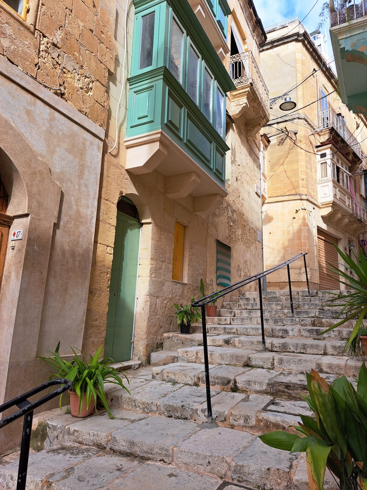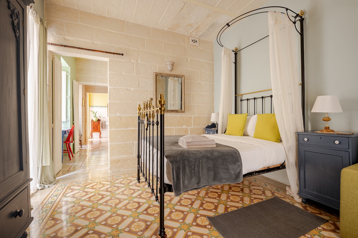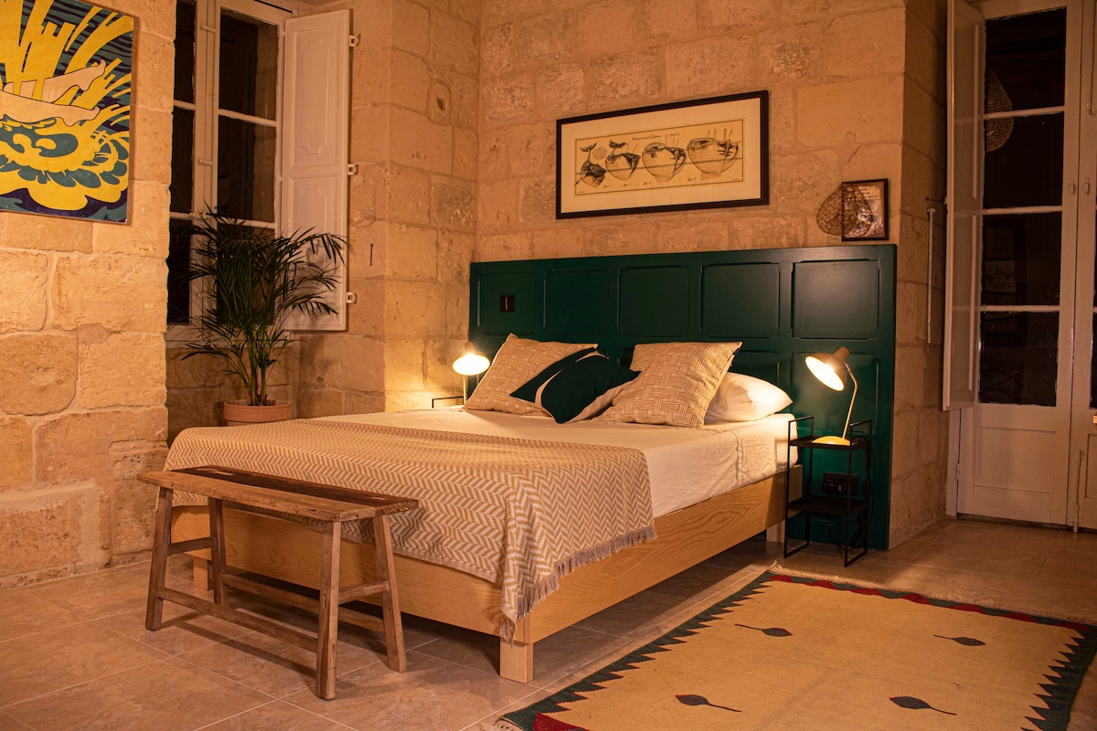 Soak up the vintage charm of this fully renovated historic landmark townhouse. Eclectic details include fishermen's net lamps, original artwork, plenty of natural light and an outdoor balcony with orginal wrought iron railing. The Marina Suite is our most spacious room within the Birgu Blue Townhouse. Centrally located in a semi-pedestrian street in Birgu, you can tour the whole island and stay in a truly authentic house setting. Please note that there is NO AC IN THE BNB.