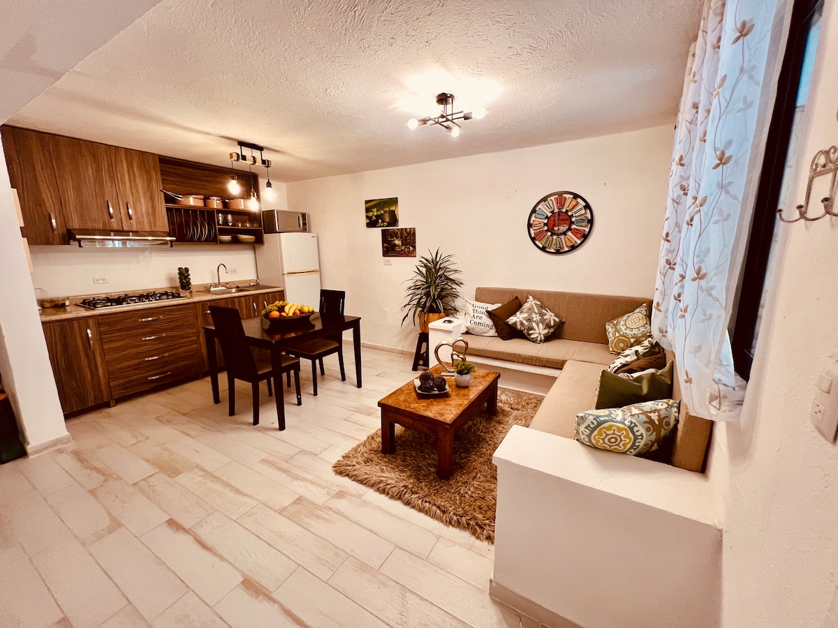 Nestled in a serene garden setting, our modern studio offers a tranquil escape just a short walk from the vibrant heart of San Miguel. Enjoy a restful stay with contemporary comforts: a plush queen-sized bed, high-speed Wi-Fi, and a fully equipped kitchenette. Start your mornings with coffee on the private patio, surrounded by lush greenery, and unwind in the evenings with a stroll to nearby cafes, galleries, and historic sites. Experience the ideal blend of relaxation and convenience.