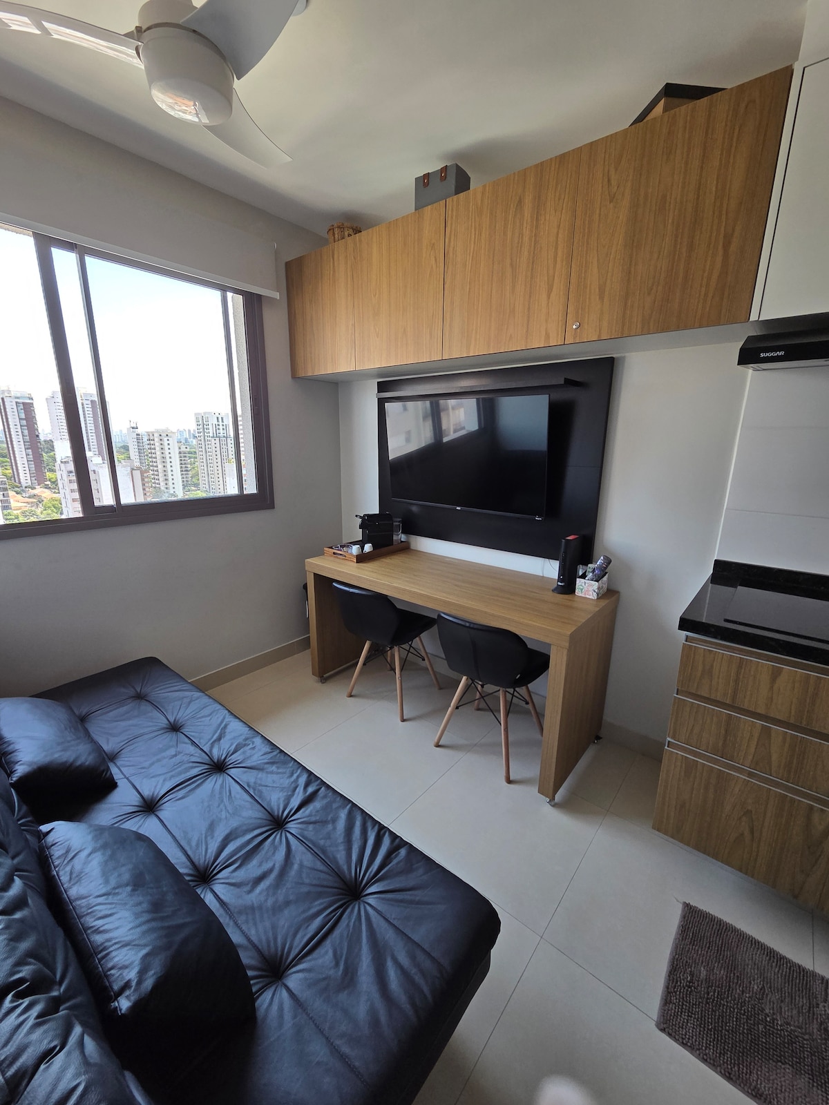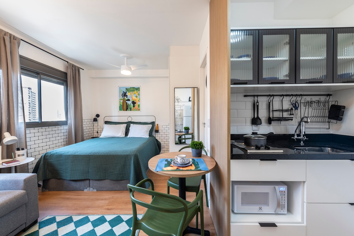 Furnished studio on the 22nd floor, with an open view, excellent natural light, and a portable air conditioner. Accommodates up to 3 guests, with a double bed and a sofa bed. Fully equipped kitchen with refrigerator, microwave, two-burner cooktop, and utensils. TV with wall panel, internet, bed linens and towels, and basic toiletries provided. A small desk with drawers and two chairs serves as a workspace or dining area. Ideal for those seeking comfort and convenience in Pinheiros.