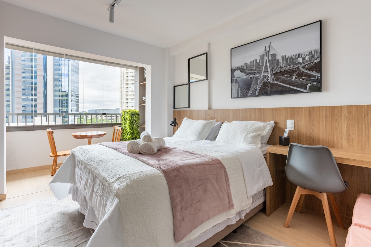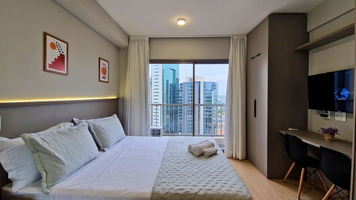 Studio lindo com uma bela vista da Av. Faria Lima na varanda, no 14º andar e com sol da manhã. Excepcionalmente completo e planejado ideal para home office, com work station, Wi-Fi rápida e ar condicionado. Seguro, com portaria blindada 24h. Confortável e prático, cama king, enxoval completo de cama e banho, cozinha super bem equipada e TV58'. Hospede-se exatamente em frente ao Shopping Eldorado, que tem tudo, e a 8min a pé da estação Faria Lima, 10min da Pinheiros ou 6 min da Hebraica-Rebouças.