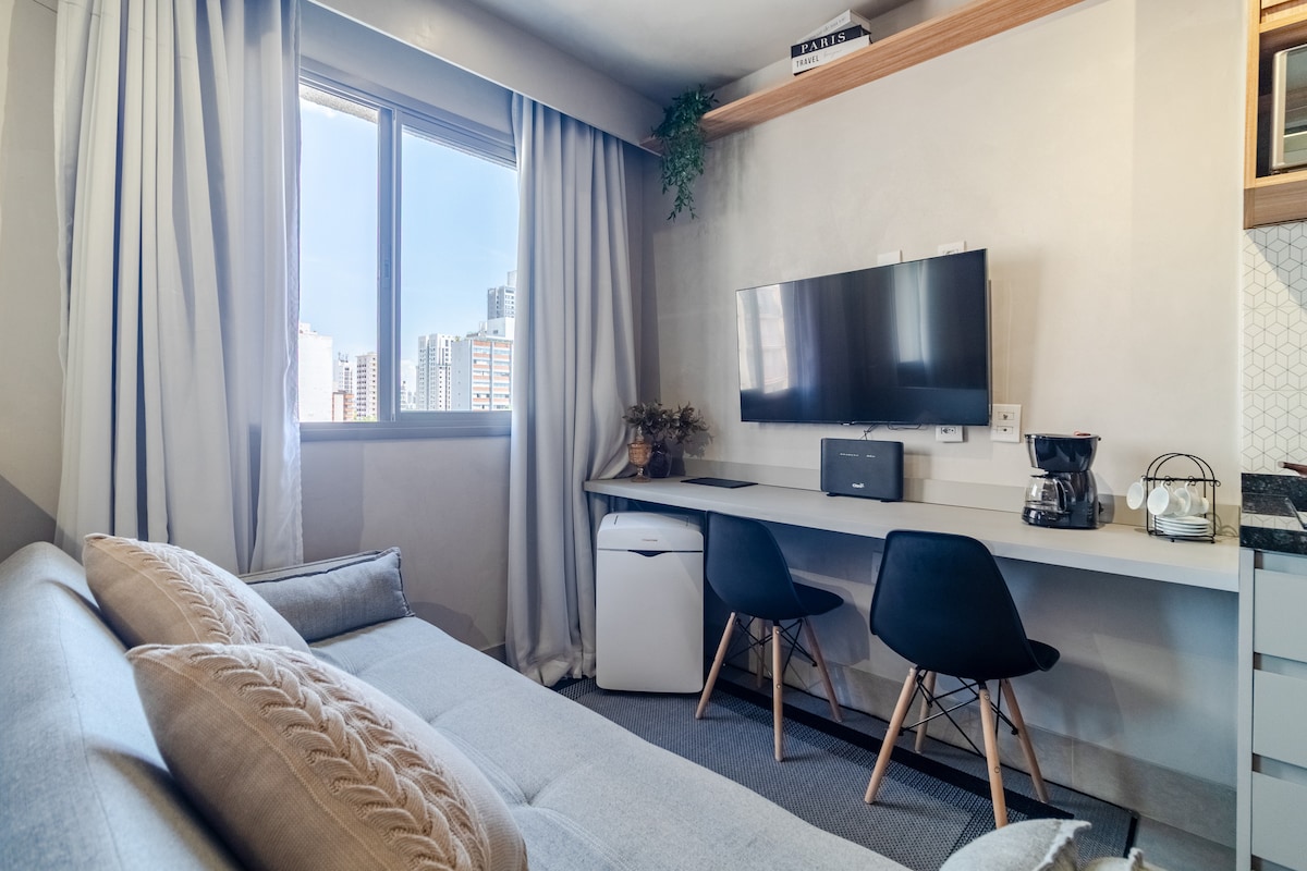 Experience One Eleven in Vila Olimpia. This modern apartment features large windows with breathtaking city views and natural light. The unit boasts 600 Mbps internet and a 4K HD TV. For total comfort, it has a Hot/Cold AC system: 27,000 BTU/h unit in the living room and 10,000 BTU/h in the bedroom. The bedroom is quiet and dark for a restful sleep. Impeccably maintained, you’ll be walking distance to top restaurants and business hubs—a safe, upscale retreat with a stunning urban backdrop.