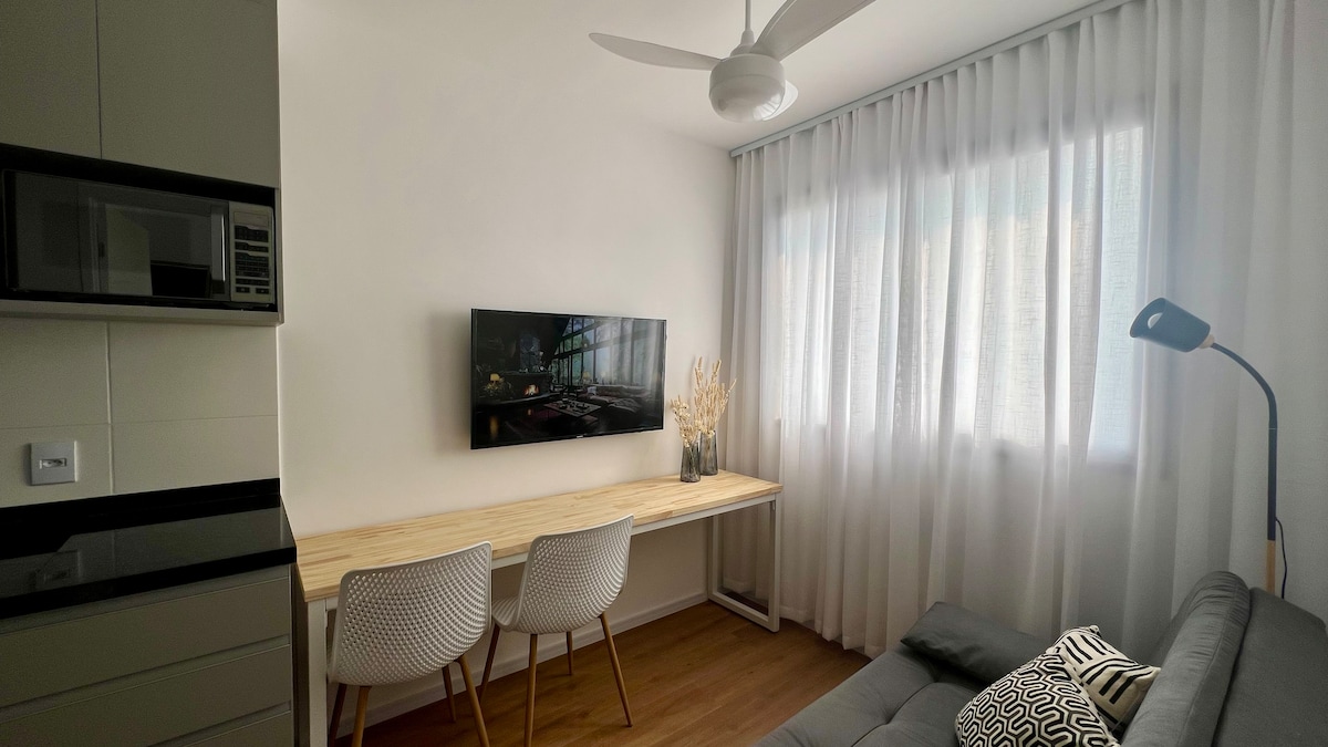 This wonderful Studio was designed to give you all the comfort and practicality you deserve. Modern and functional environment, with smart lighting integrated with Alexa, thought of every detail for you! Enjoy the day at the events surrounding the site or quickly access the city's main thoroughfares. At night, enjoy the bars and restaurants, and then rest comfortably, as the apartment has soundproofing, blackout curtains and silent air conditioning.