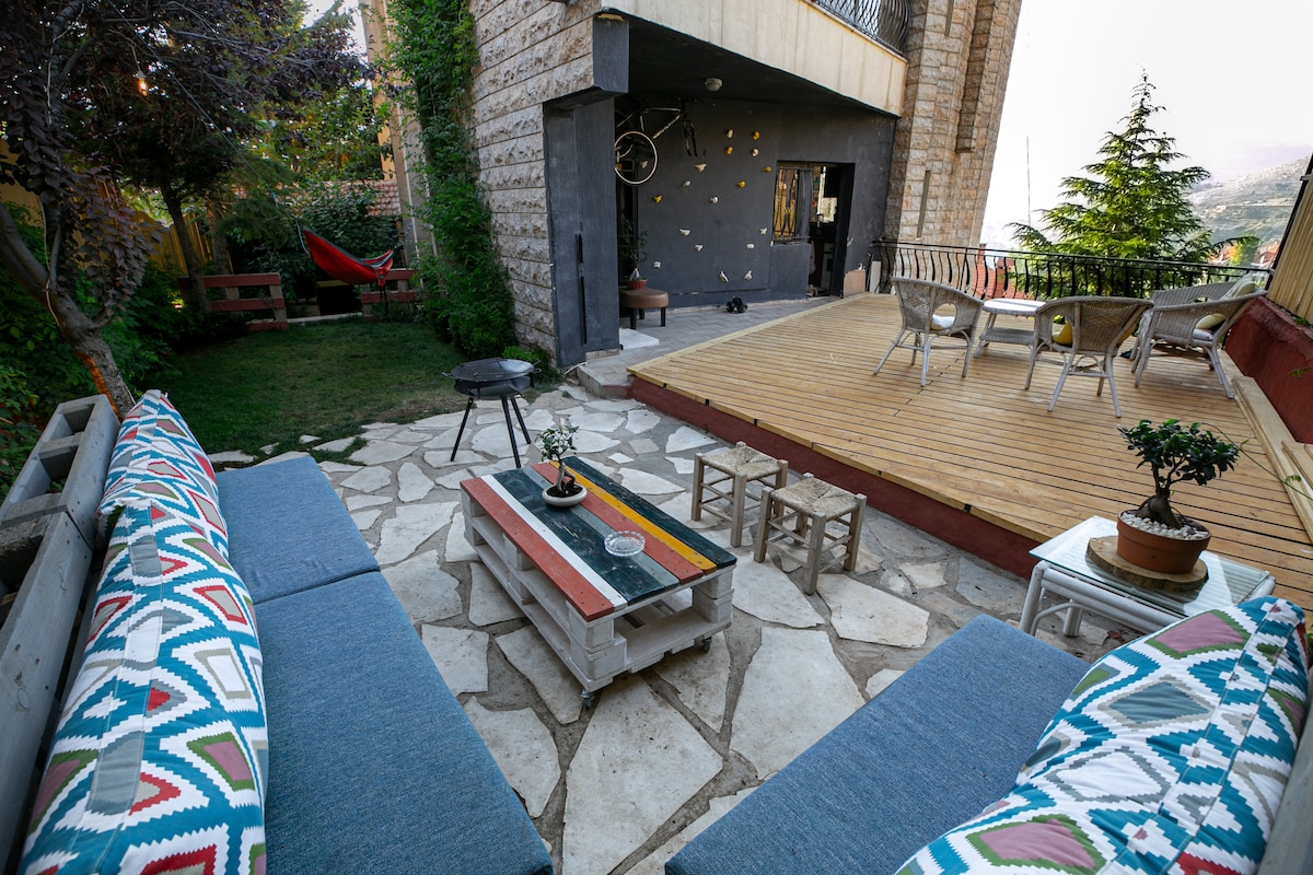 All reservations include concierge, 24/7 electricity, trip planning, and free parking. ★ "Beautiful log house with pristine views! Several trails for hiking in the area, at walking distance. Highly recommended.” 140m² duplex villa with large terrace and breath taking views. ☞ No checkout rules ☞ 24/7 Electricity & Heating ☞ Baby Crib and High Chair Free of Charge Upon Request ☞ 5 Minute Drive From Mzaar Ski Resort ☞ HD TV with Netflix ☞ BBQ Grill with Lounge Area