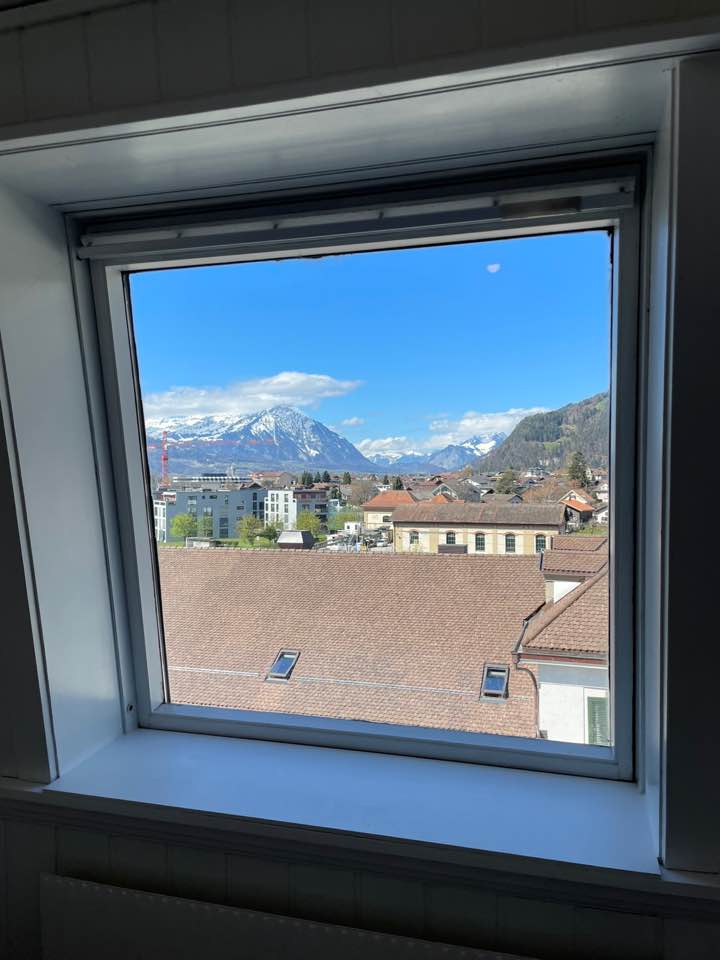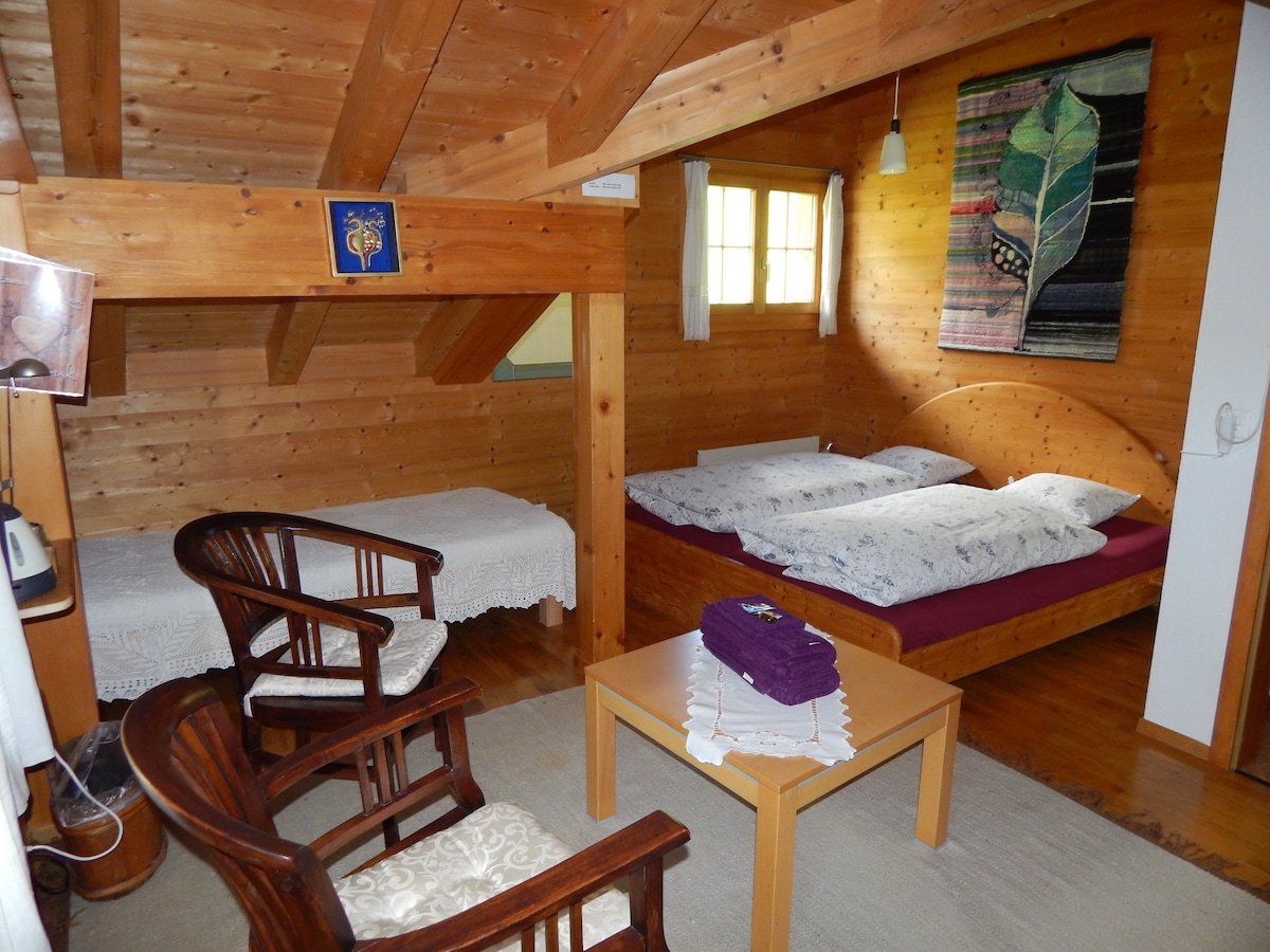 Dreierzimmer in einem alten Chalet in Gimmelwald. Das Haus ist von Gärten und landwirtschaftlichen Gebäuden umgeben. Das Haus liegt ruhig und hat eine unglaubliche Sicht auf die Berge. Die Seibahnstation ist 3 Minuten vom Haus entfernt.