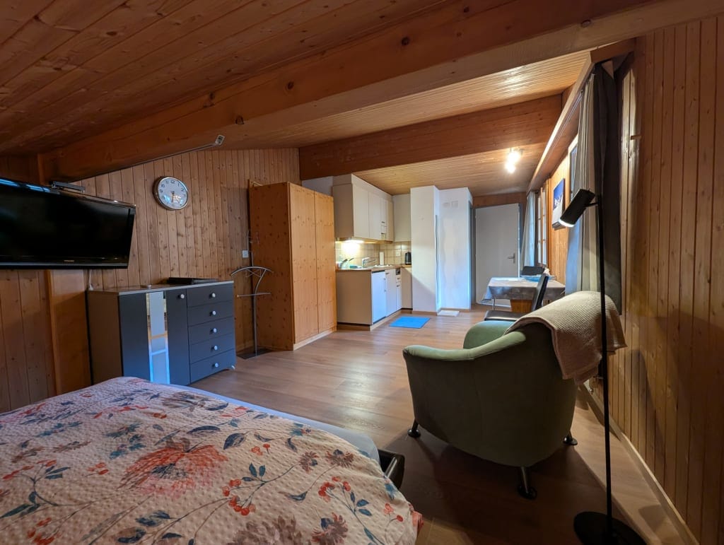 - 7 min with bus to Interlaken Ost every 30 min - free parking - newly renovated - 1 room studio (30m2) w/separate bathroom - sleeping lounge (very low ceiling, watch head) w/king size bed - sofa bed (140x200 cm) - fully equipped kitchen - washing machine (no dryer) in studio - max. 4 guests incl. infants - free WIFI - access to balcony - access to garden with mountain views, BBQ area - located in a tranquil neighbourhood - grocery shop, butcher, bakery, ATM, lake in walking distance