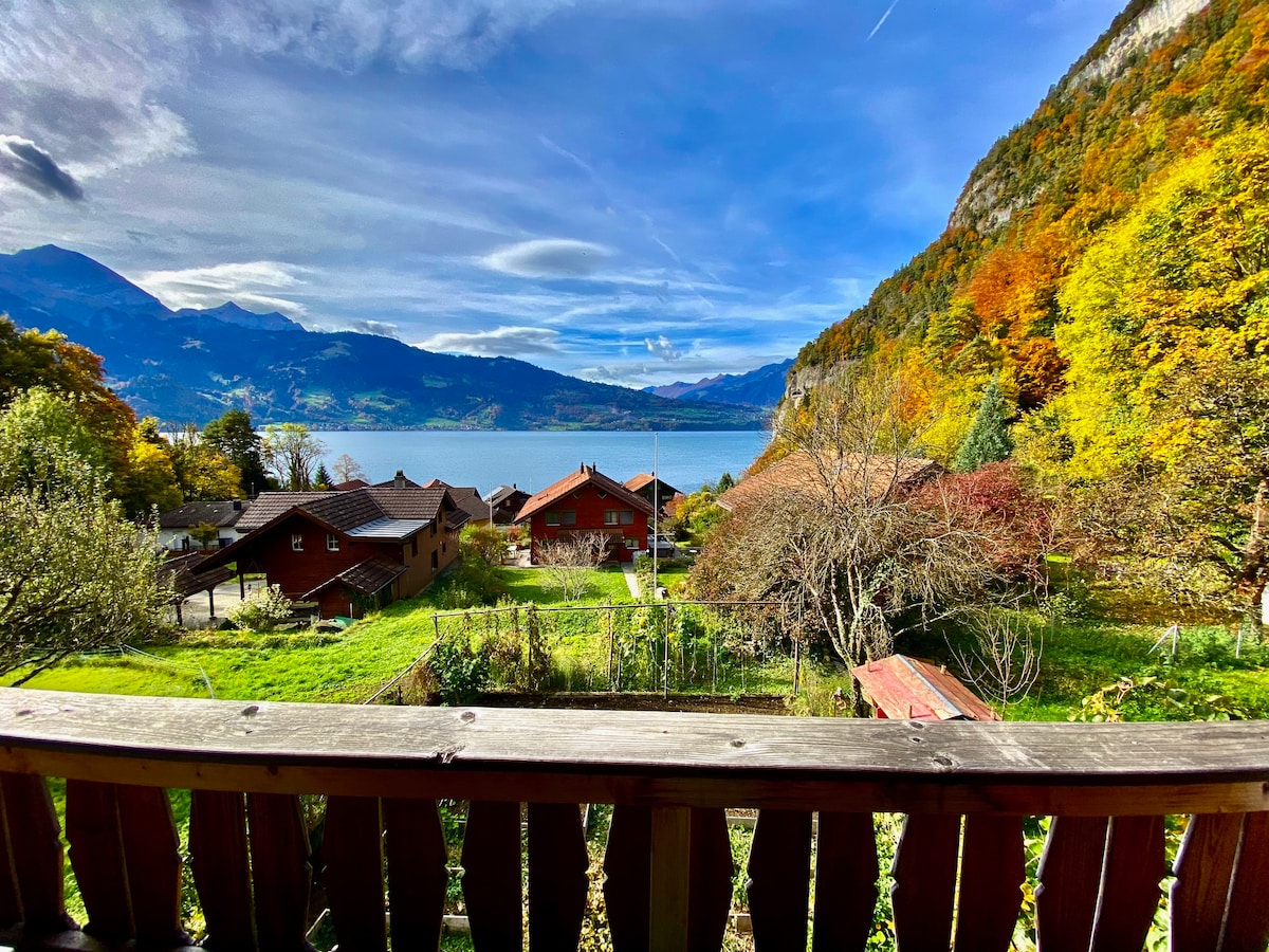 Unser Traditionelles Holz Chalet liegt am Südhang leicht erhöht über dem Brienzersee. Von der Ferienwohnung aus geniessen Sie einmalige, wunderschöne Aussicht über den grünblauen Brienzersee mit umliegenden Bergen! Die Wohnung liegt im Parterre und hat direkter Zugang zur Garten mit Terasse +See/Bergsicht Es sind 3Min zu Fuss zum Seeufer. GRATIS PARKPLATZ direkt neben dem Haus. Viele Sportliche-Ausflugsmöglichkeiten in der Nähe. Trampoline ist nur für unsere Gäste. *Sehr beliebt für Homeoffice*